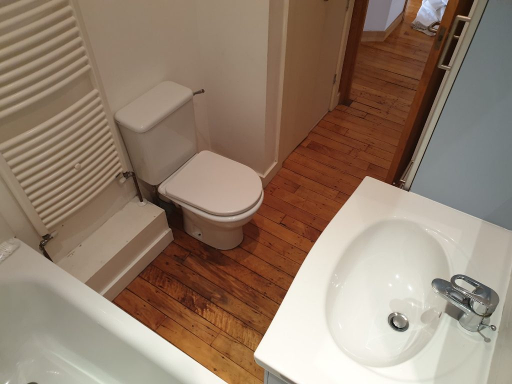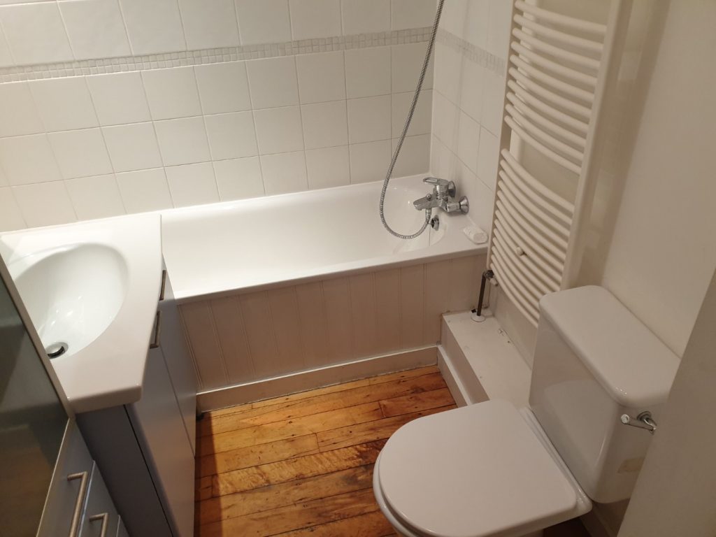 Bathroom : 3.89m x 2.07m (12'9" x 6'9") , The bathroom features a bath with mixer taps and shower, a modern toilet, and contemporary wash hand basin in a contemporary unit, electric shaver point, spotlights, heated towel rail, part tiled walls and the original solid wood flooring.