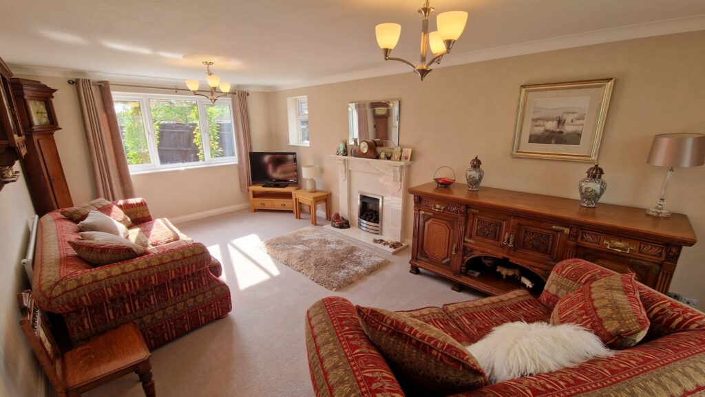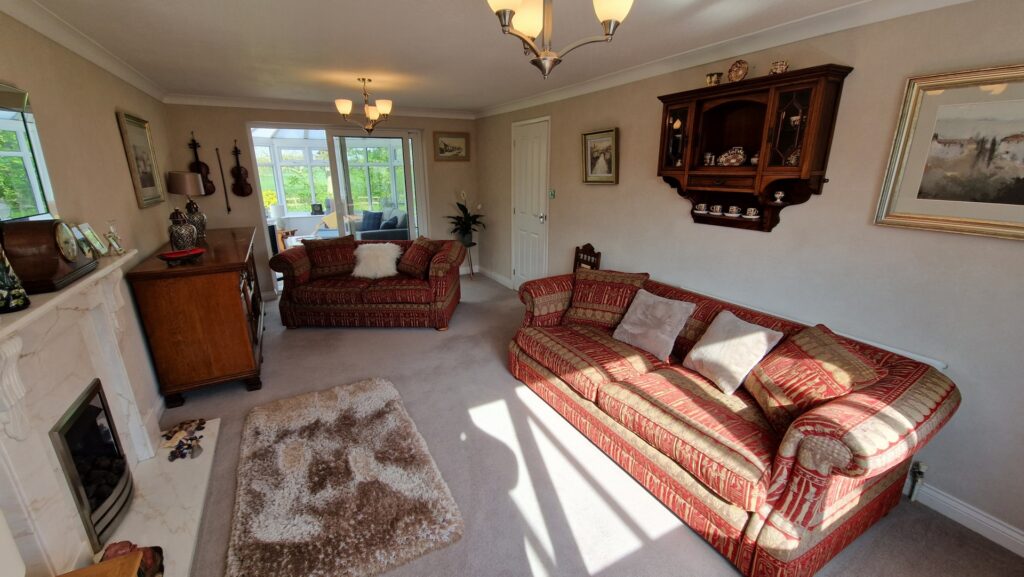 Lounge: 3.55m x 6.25m (11'8" x 20'6"), The lounge is the full length of the house and features a gas fireplace with marble surround, a large UPVC double glazed window overlooking the front garden, a smaller UPVC double glazed window overlooking the driveway and a UPVC double glazed sliding patio door which leads to the conservatory.