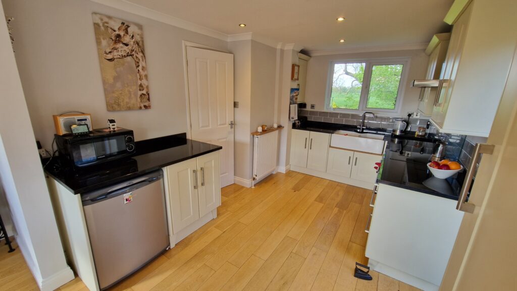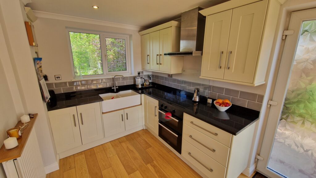 Kitchen: 2.80m x 3.50m (9'2" x 11'6"), The kitchen / diner benefits from a range of modern wall and base units with a solid granite worktop and oak floors. There is a built-in electric double oven, a ceramic hob and stainless-steel cooker hood. The kitchen also features a double Belfast sink and space for a freestanding under counter fridge or freezer. There is a UPVC double glazed window overlooking the garden, and a UPVC double glazed door leading to the side of the property.