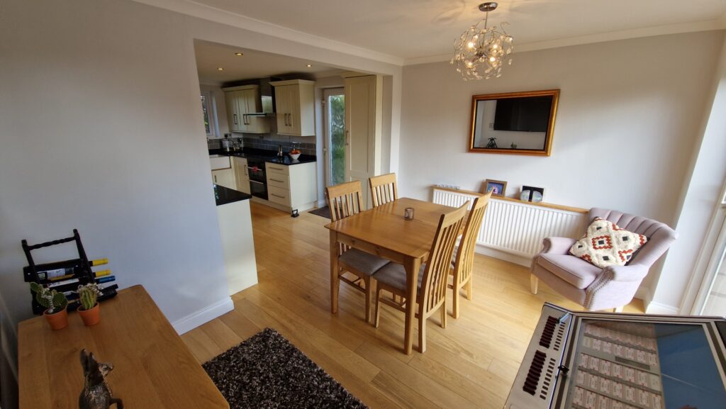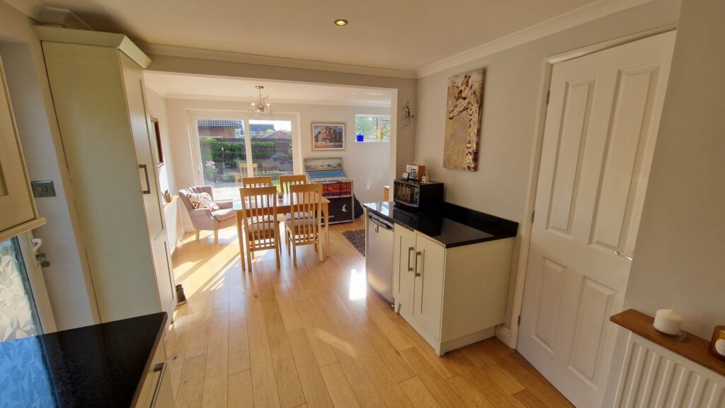 Diner: 4.75m x 2.75m (15'7" x 9'0"), The dining area benefits from the same oak floors and a UPVC double glazed sliding patio door leading to the front garden. There is also a walk-in pantry for additional storage and a high level UPVC double glazed window providing extra natural light.