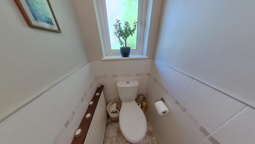 WC: 0.90m x 1.60m (2'11" x 5'3"), The downstairs WC benefits from a modern white suite including a push button toilet and wash hand basin with mixer tap and matching pedestal. There is a UPVC double glazed window and a gas central heating radiator.