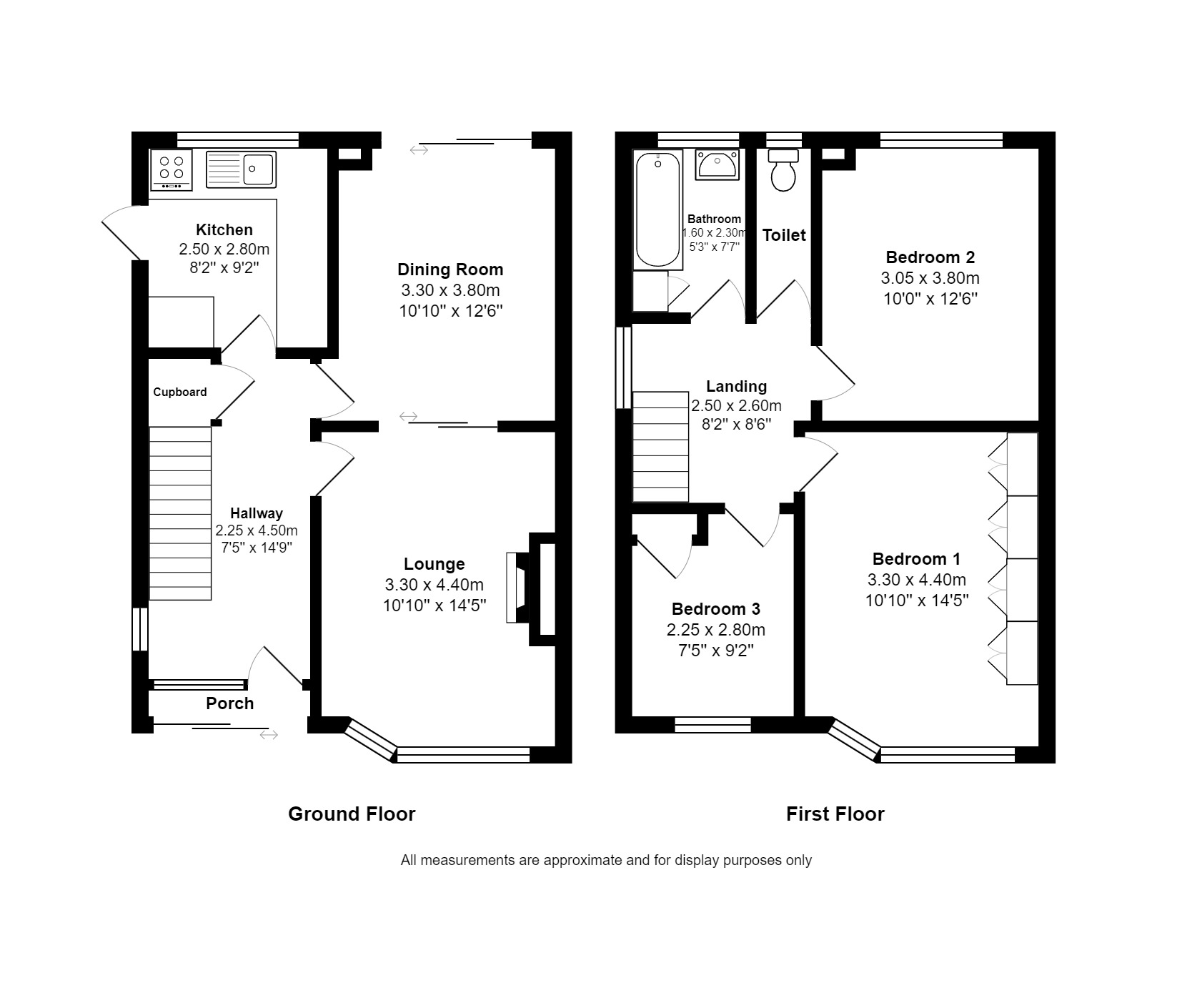 Bedroom 3: 2.25m x 2.80m (7'5" x 9'2"), Bedroom 3 is located to the front of the property over the hallway. It benefits from a UPVC double glazed window, a gas central heating radiator, and a built-in cupboard.