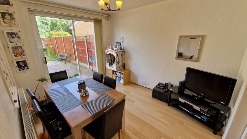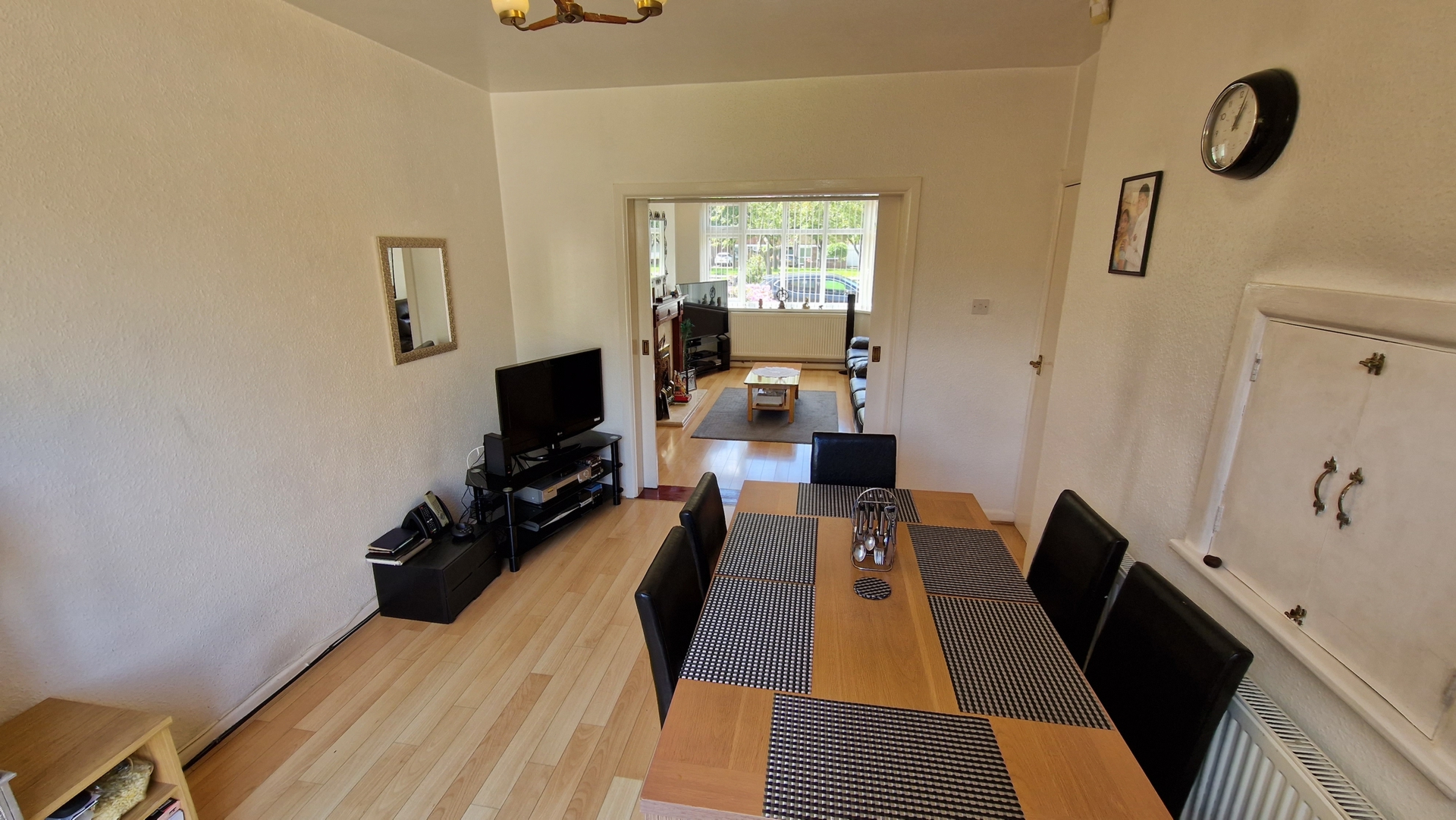 Dining Room: 3.30m x 3.80m (10'10" x 12'6"), The dining room is located to the rear of the property and has a large double glazed sliding door leading to the patio outside. The room benefits from laminate flooring and a gas central heating radiator.