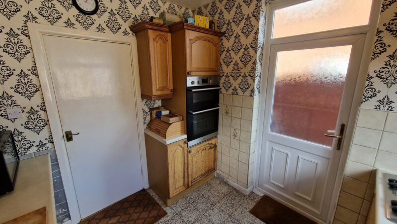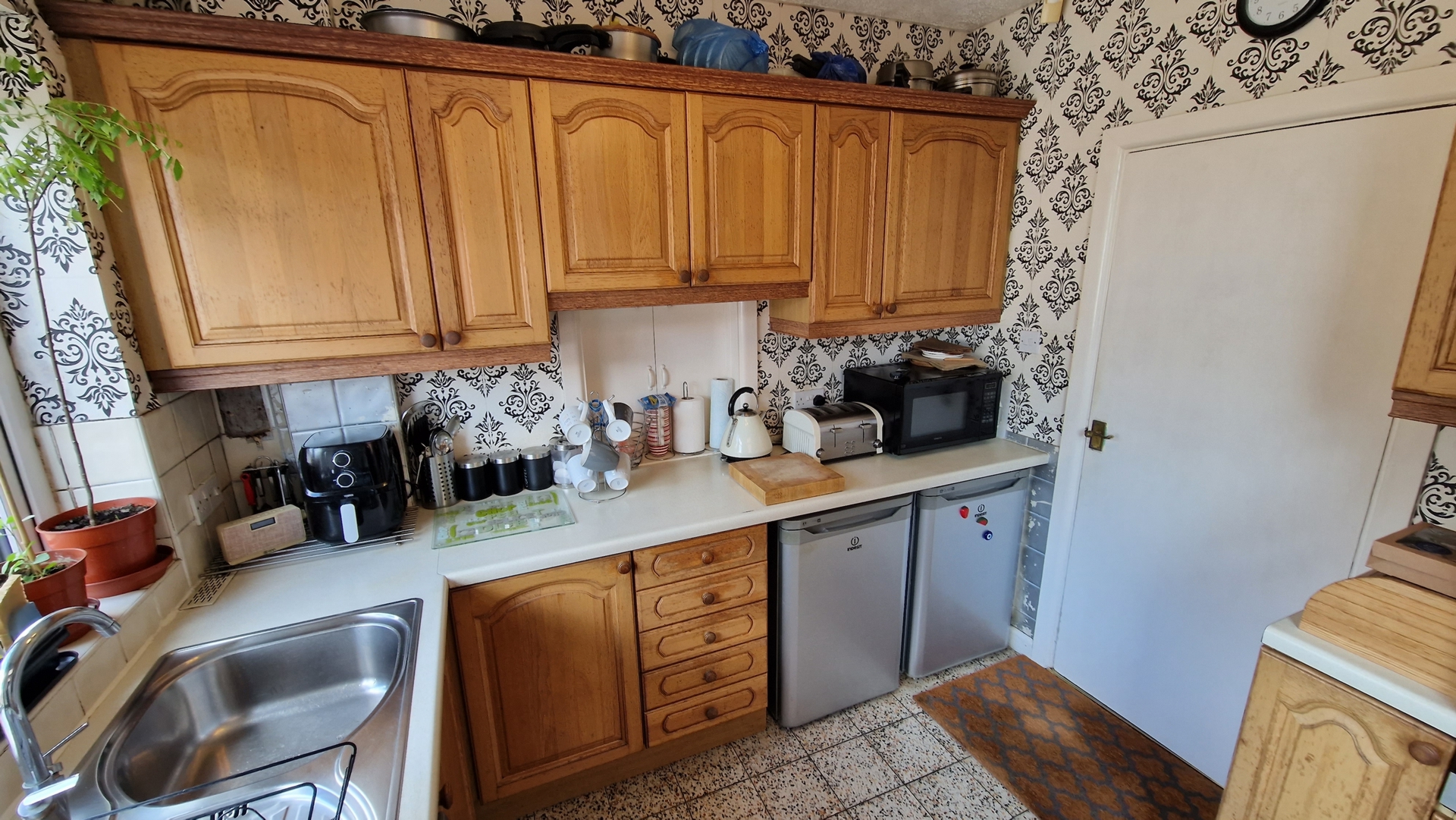 Kitchen: 2.50m x 2.80m (8'2" x 9'2"), The kitchen features a range of matching wall and base units, and benefits from a built-in double oven, gas hob, extractor hood. There are also spaces for a freestanding washing machine and an under counter fridge and freezer. There is a large UPVC double glazed window overlooking the garden, and a UPVC double glazed door leading to the side of the property.