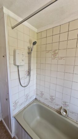 Bathroom: 1.60m x 2.30m (5'3" x 7'7"), The bathroom is located to the rear of the property over the kitchen. It benefits from a bath with electric shower and a wash hand basin set within a wooden vanity unit. There is a UPVC double glazed window with privacy glass and a gas central heating towel rail.