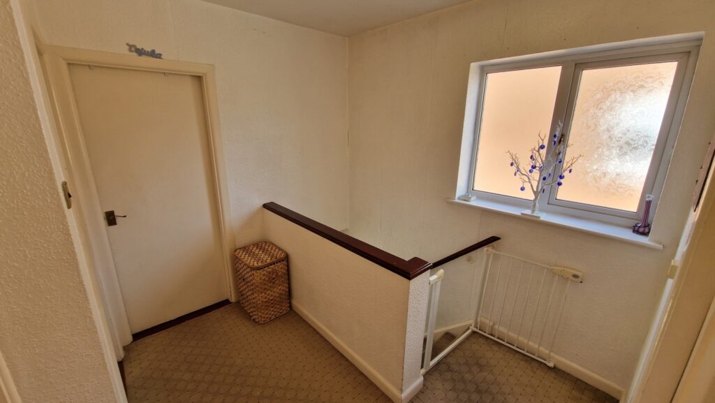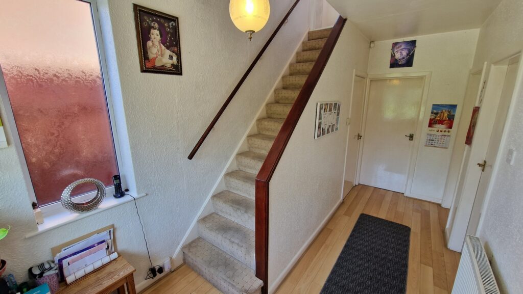 Hallway: 2.25m x 4.50m (7'5" x 14'9"), The hallway is accessed through the porch via a UPVC double glazed door. There are two UPVC double glazed windows, laminate flooring, and a gas central heating radiator. The hallway provides access to the lounge, dining room, kitchen and an understairs cupboard via wooden doors, and there is a staircase that leads to the first floor.