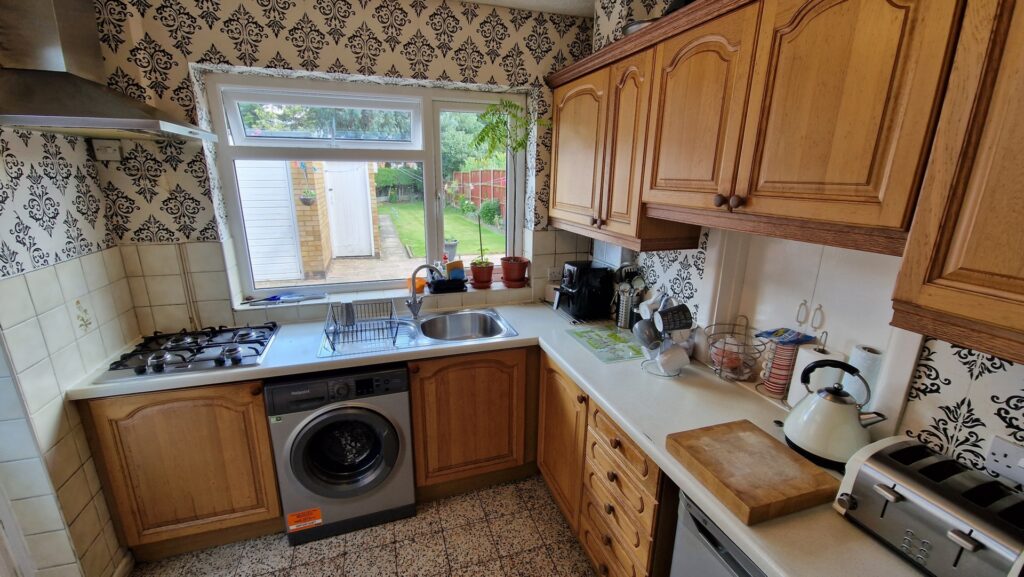 Kitchen: 2.50m x 2.80m (8'2" x 9'2"), The kitchen features a range of matching wall and base units, and benefits from a built-in double oven, gas hob, extractor hood. There are also spaces for a freestanding washing machine and an under counter fridge and freezer. There is a large UPVC double glazed window overlooking the garden, and a UPVC double glazed door leading to the side of the property.