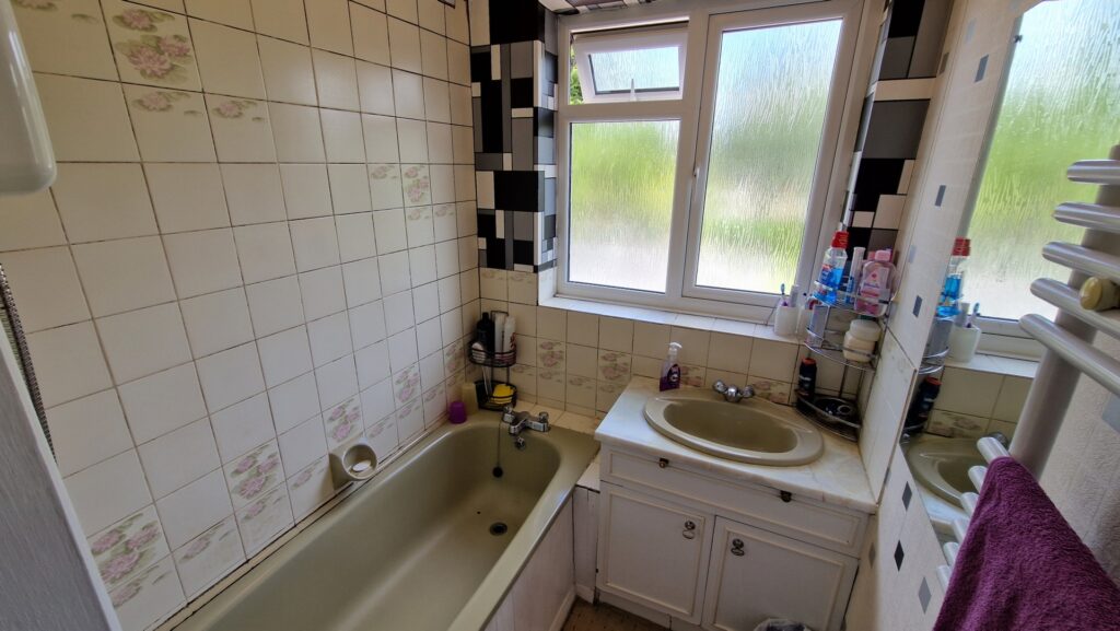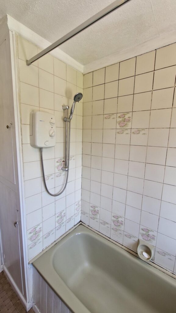 Bathroom: 1.60m x 2.30m (5'3" x 7'7"), The bathroom is located to the rear of the property over the kitchen. It benefits from a bath with electric shower and a wash hand basin set within a wooden vanity unit. There is a UPVC double glazed window with privacy glass and a gas central heating towel rail.