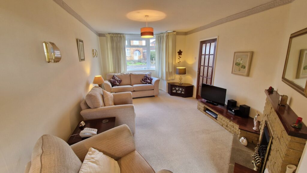 Living Room: 3.40m x 5.30m (11'2" x 17'5"), The living room is located to the front of the property and features a large half bay with a UPVC double glazed window overlooking the driveway. The room also benefits from a gas fireplace, a gas central heating radiator and an open square arch that leads to the dining room.