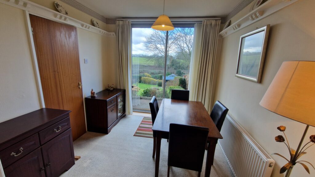 Dining Room: 2.65m x 2.65m (8'8" x 8'8"), The dining room is located to the rear of the property and features stunning views over the garden through a sliding patio door. The room also benefits from a large gas central heating radiator and wooden door that leads to the kitchen.