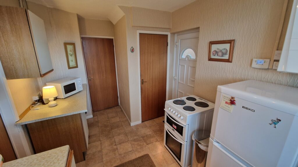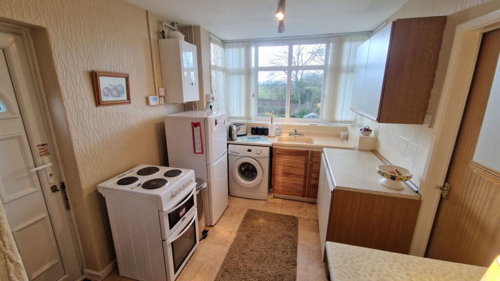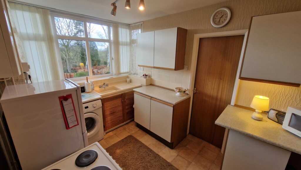 Kitchen: 2.50m x 4.25m (8'2" x 13'11"), The kitchen is located to the rear of the property and benefits from a square bay with UPVC double glazed windows overlooking the garden. The room features matching wall and base units with spaces for a freestanding washing machine, fridge freezer and an electric cooker. There is also a modern gas boiler and a UPVC double glazed door that provides direct access to the garden. There is also a walk-in pantry for additional storage.