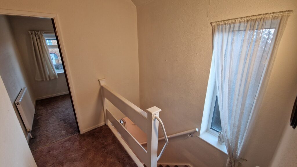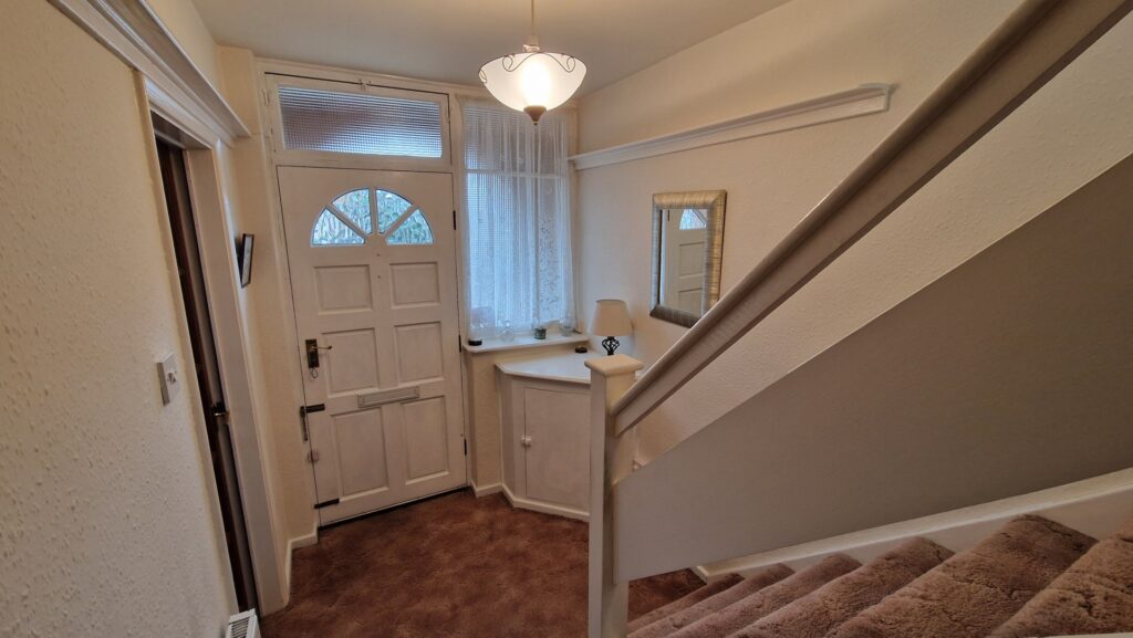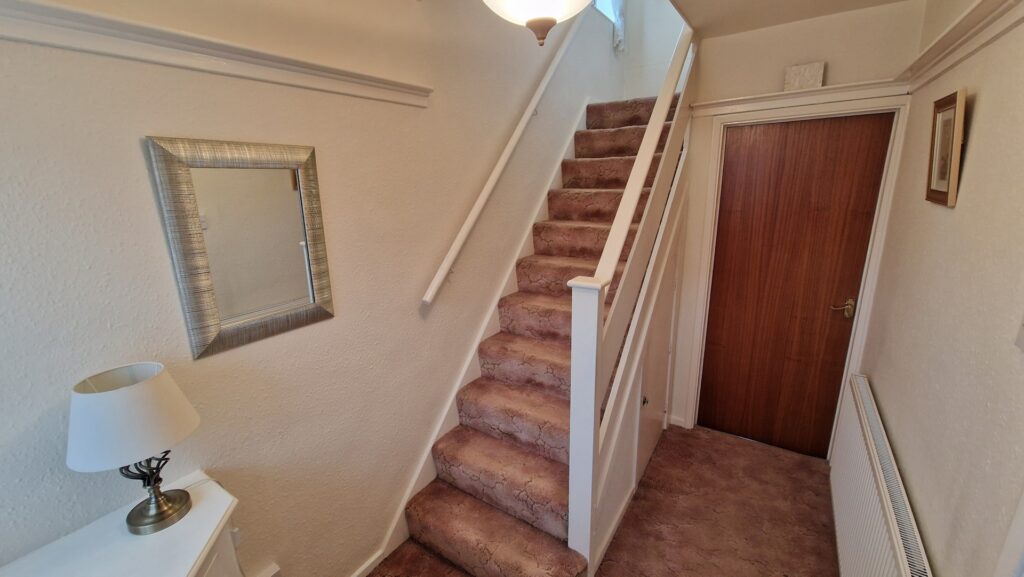 Hallway: 1.80m x 3.00m (5'11" x 9'10"), The hallway is accessed via an open porch and provides access to the living room and kitchen. The room also features a staircase that leads to the first floor with a cupboard underneath and a gas central heating radiator.