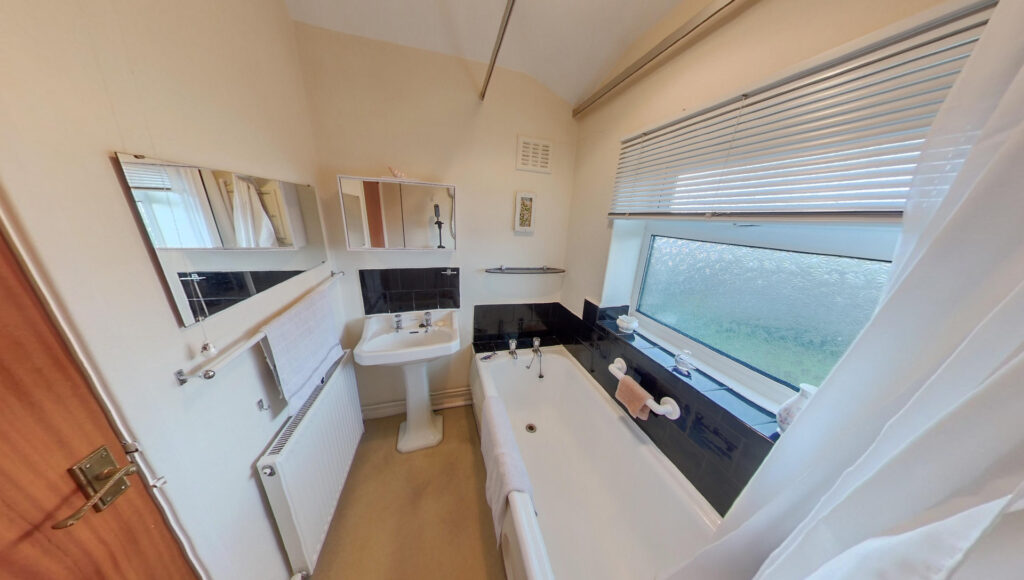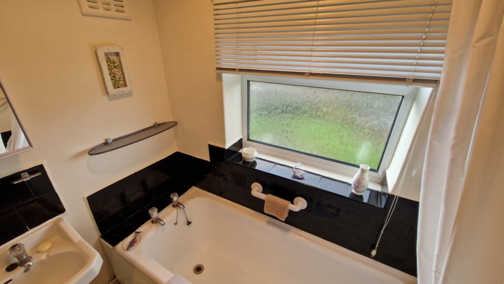 Bathroom: 1.65m x 1.50m (5'5" x 4'11"), The bathroom is located to the rear of the property and benefits from a white suite with black tiles above. The suite includes a bath with an electric shower and a wash hand basin with matching pedestal. The room also benefits from a gas central heating radiator and a UPVC double glazed window with privacy glass.