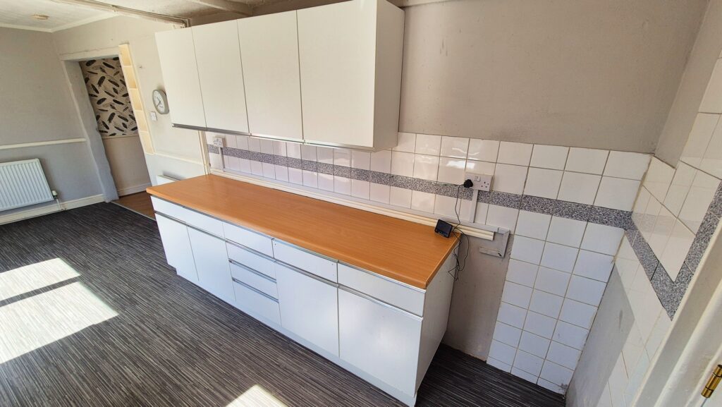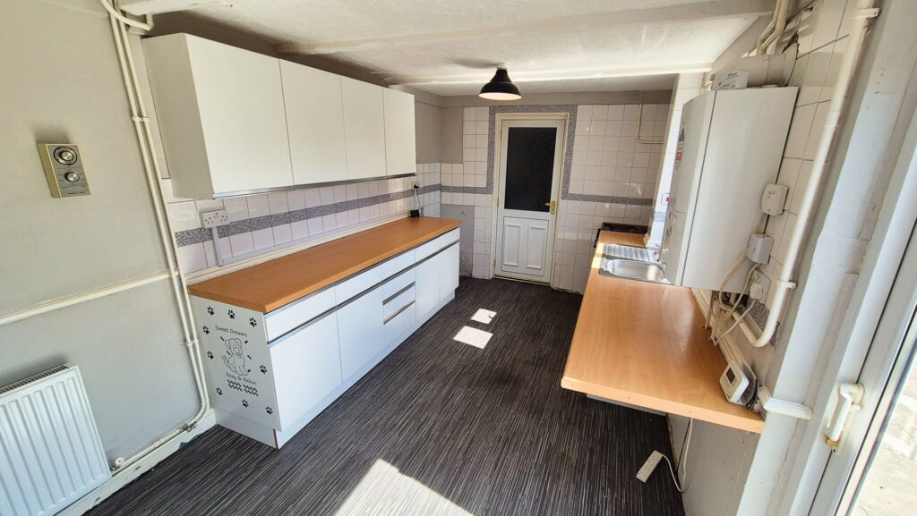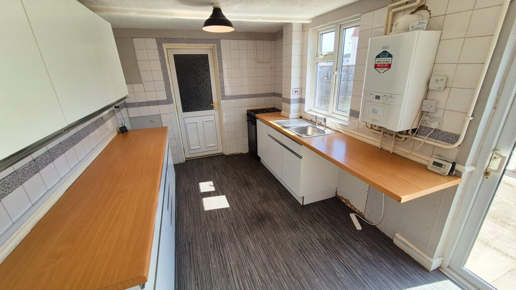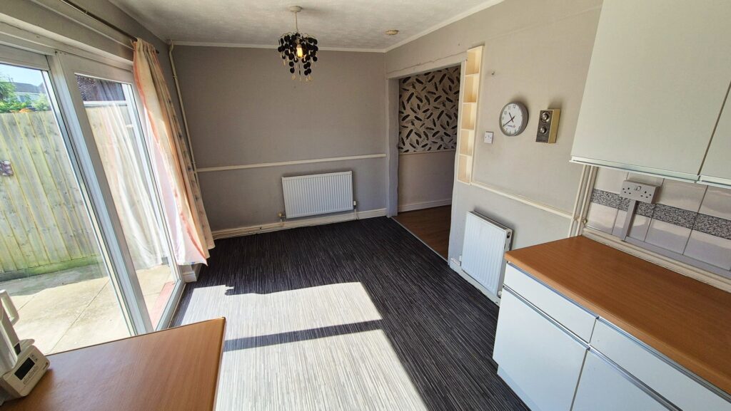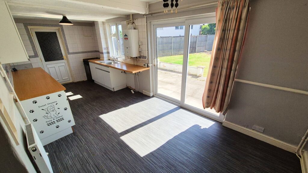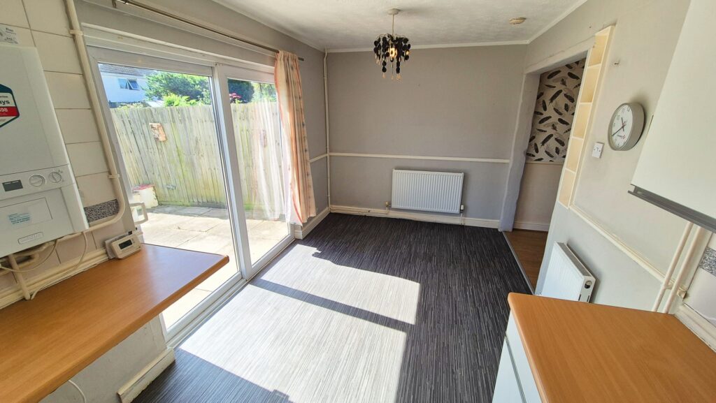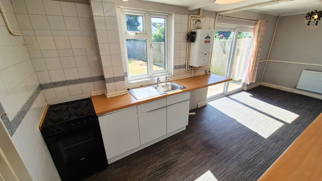 Kitchen / Diner: 6.40m x 2.60m (20'12" x 8'6"), The kitchen / diner is located to the rear of the property off the living room. It benefits from a range of wall and base units and includes a freestanding electric cooker, and spaces for a freestanding washing machine, dishwasher/tumble dryer and a fridge freezer. The room also benefits from a UPVC double glazed window, a UPVC sliding patio door that leads to the garden and a double glazed door that leads to the garage on the side of the property.