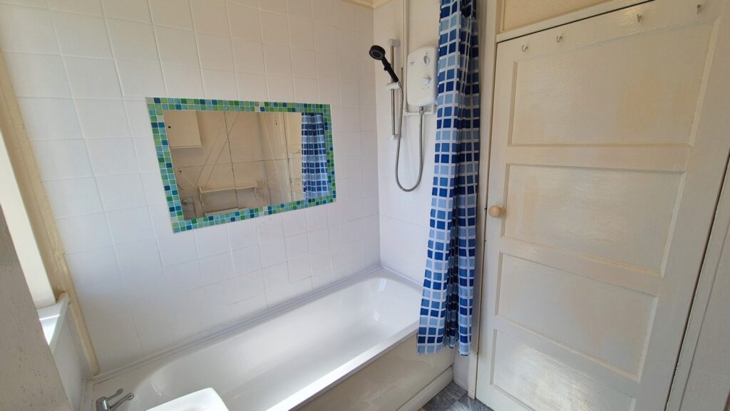Bathroom: 2.20m x 1.75m (7'3" x 5'9"), The bathroom features a white suite including a push button toilet, a wall hung basin, and a bath with an electric shower. The room also benefits from a UPVC double glazed window and a gas central heating towel radiator.
