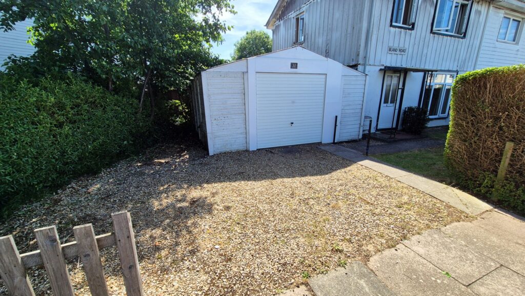 Outside: To the front of the property is a gravel driveway that leads to a large freestanding concrete and asbestos garage. To the rear of the property is an enclosed garden made up of a large lawn, and a raised patio.