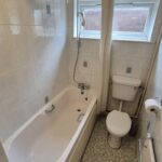 Bathroom: 2.75m x 1.40m (9'0" x 4'7"), The bathroom is located between bedroom 2 and the kitchen. It features a white suite including a bath with a shower off the taps, a wash hand basin with a matching pedestal and a toilet. The room benefits from a high-level UPVC double glazed window with privacy glass, and a gas central heating radiator.