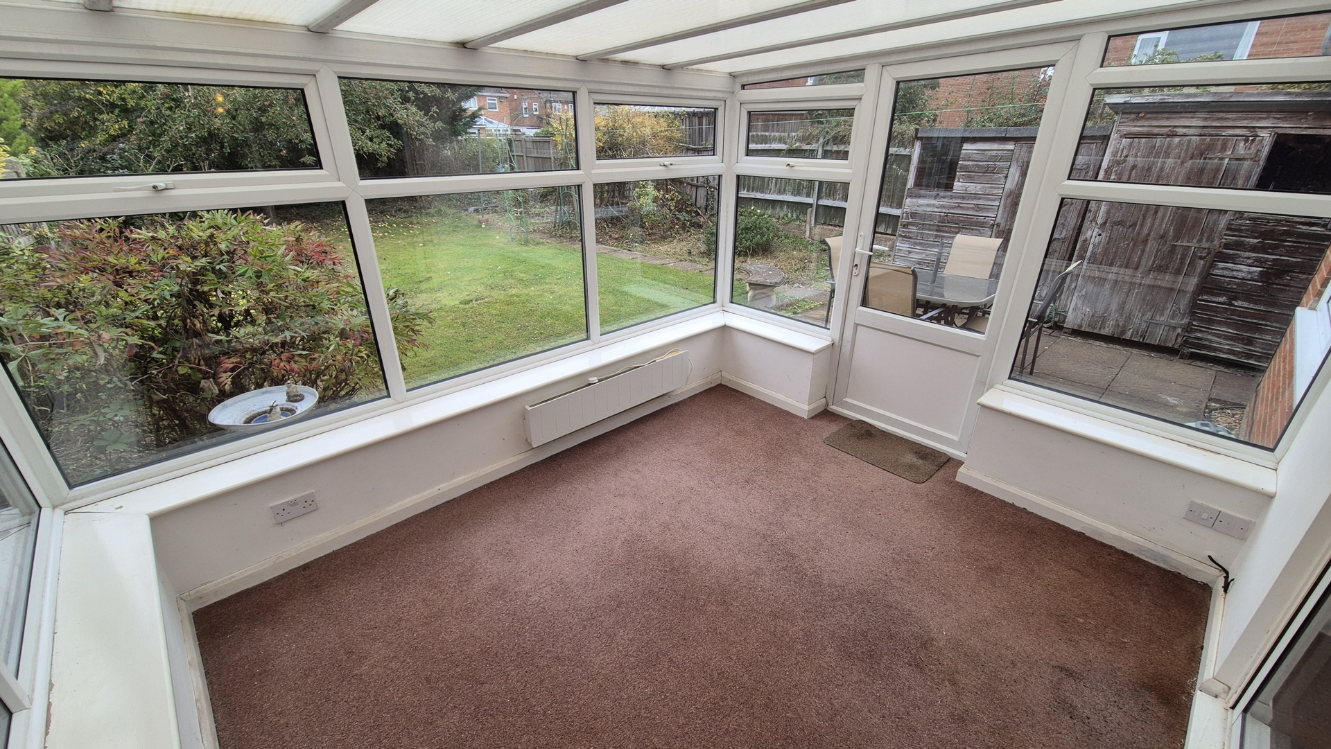 Conservatory: 3.00m x 2.70m (9'10" x 8'10"), The UPVC conservatory features windows on 3 sides with one also having a door that leads to the patio. There is a Perspex roof, and a wall mounted electric heater and light.