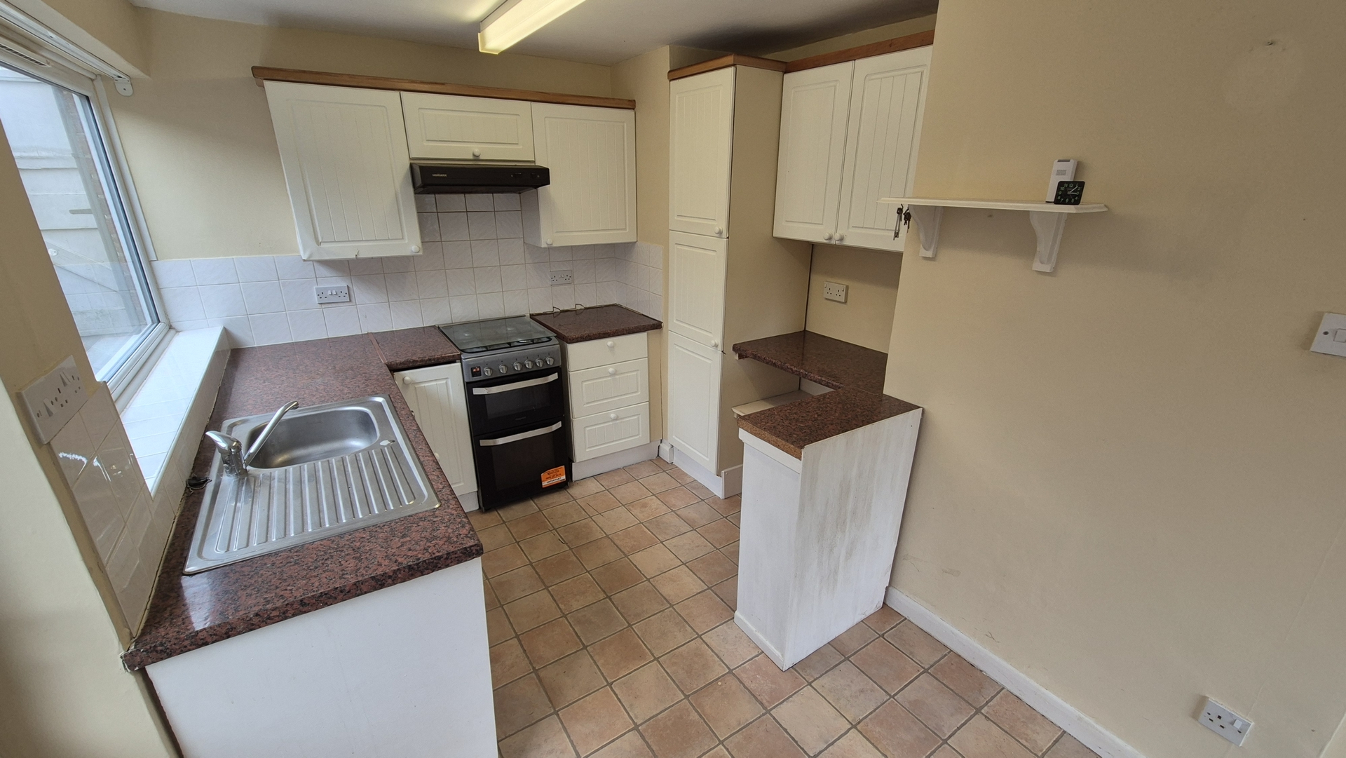 Kitchen / Diner: 2.30m x 5.40m (7'7" x 17'9"), The kitchen / diner is located towards the rear of the property and features a range of matching wall and base units with a faux marble worktop. There is a freestanding gas cooker with an extractor hood above and space for a washing machine. The room also benefits from a large gas central heating radiator, 2 large UPVC double glazed windows and a UPVC double glazed door that leads to the side of the property.