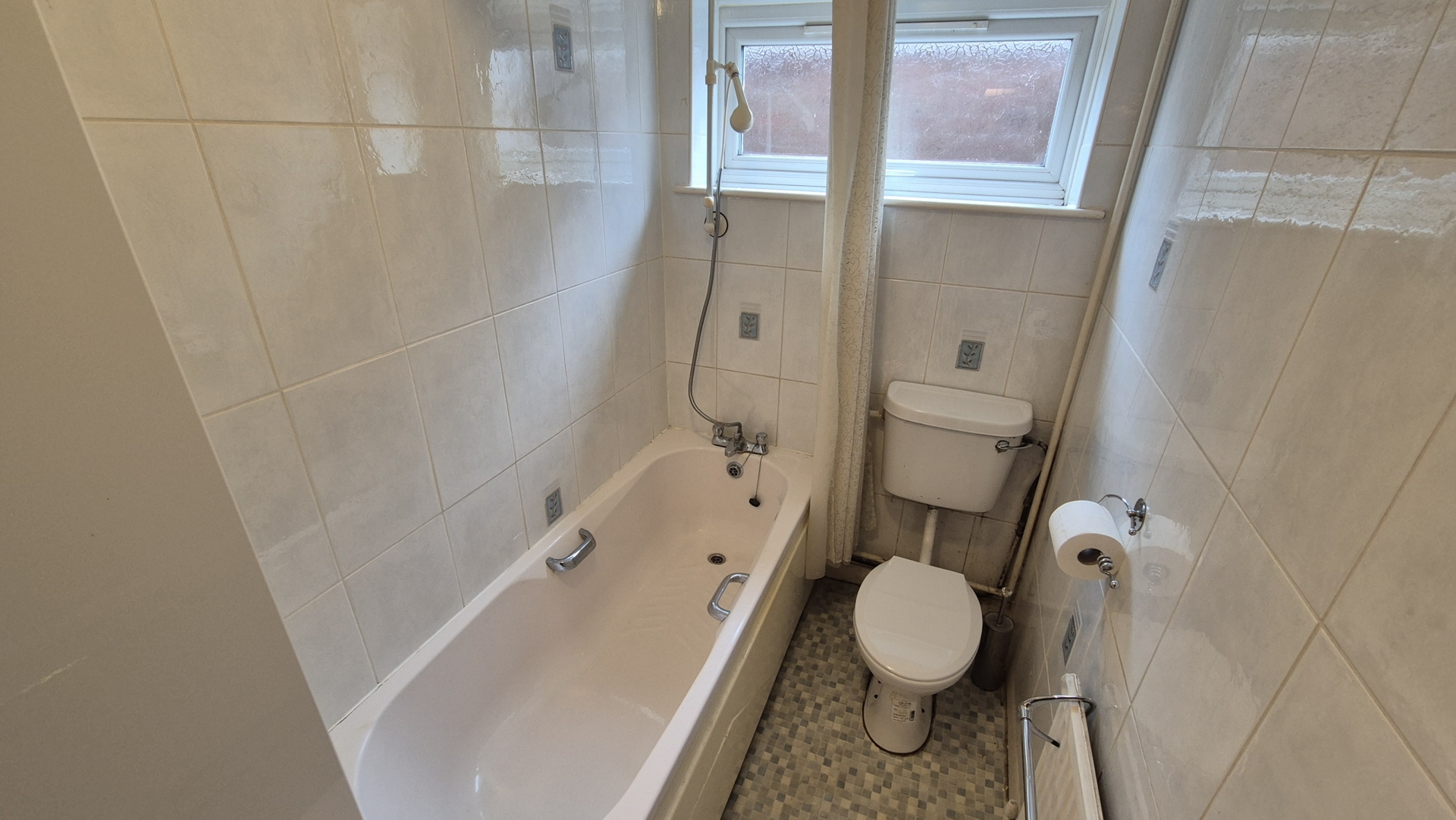 Bathroom: 2.75m x 1.40m (9'0" x 4'7"), The bathroom is located between bedroom 2 and the kitchen. It features a white suite including a bath with a shower off the taps, a wash hand basin with a matching pedestal and a toilet. The room benefits from a high-level UPVC double glazed window with privacy glass, and a gas central heating radiator.