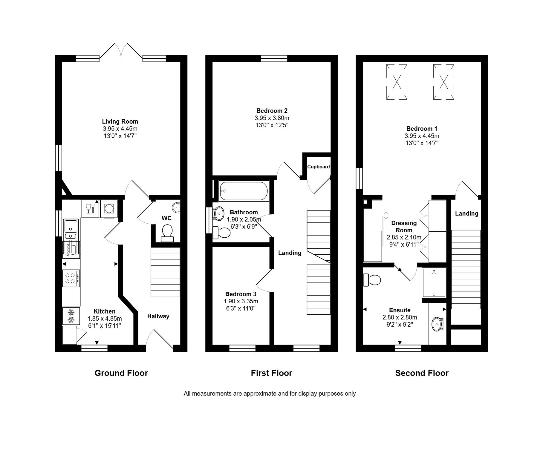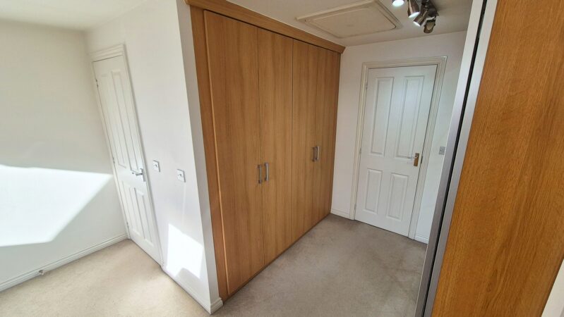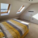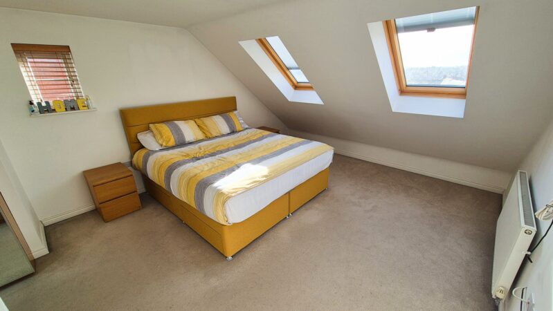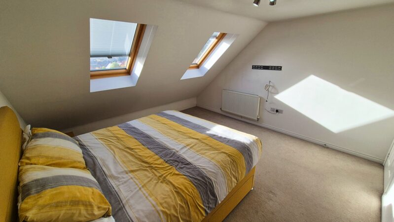 Bedroom 1: 3.95m x 4.45m (12'12" x 14'7"), Bedroom 1 is located on the second floor above bedroom 2. It benefits from 2 large Velux windows with integrated blinds, a UPVC window to the side and a gas central heating radiator. The room also benefits from a dressing room with a built-in wardrobe and a freestanding wardrobe with sliding door (which can be left by negotiation). (Please note: this room has reduced headroom in areas due to the pitch of the roof).