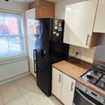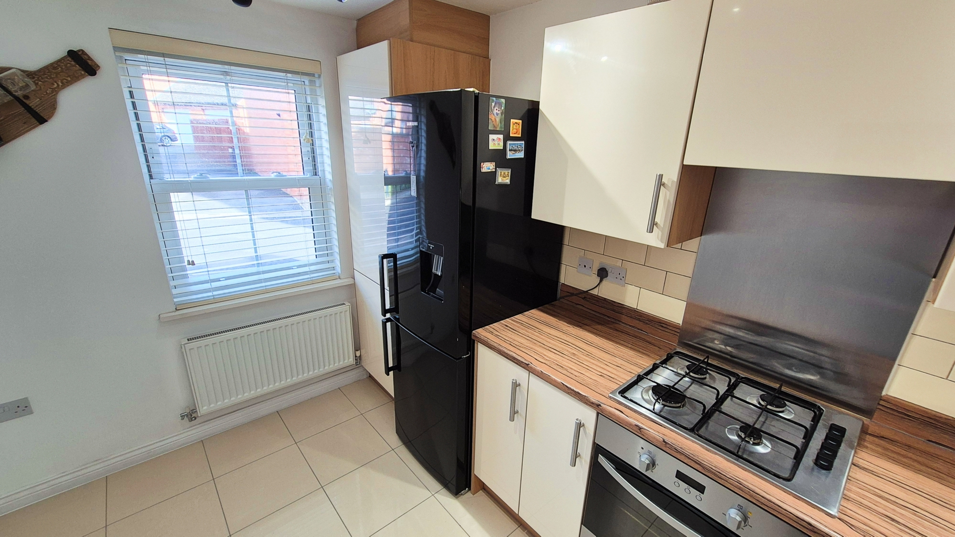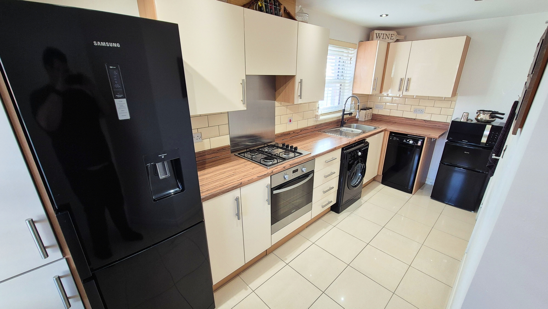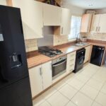 Kitchen: 1.85m x 4.85m (6'1" x 15'11"), The kitchen is located towards the front of the property and features a range of matching wall and base units. There is a built-in electric single oven with a 4-burner gas hob and an integrated extractor hood above. The kitchen also provides spaces for a freestanding washing machine, a slimline dishwasher, and a freestanding fridge / freezer. Towards the end of the kitchen there is a tall kitchen cupboard that houses the boiler. The room benefits from 2 UPVC double glazed windows, a gas central heating radiator and tiled flooring.
