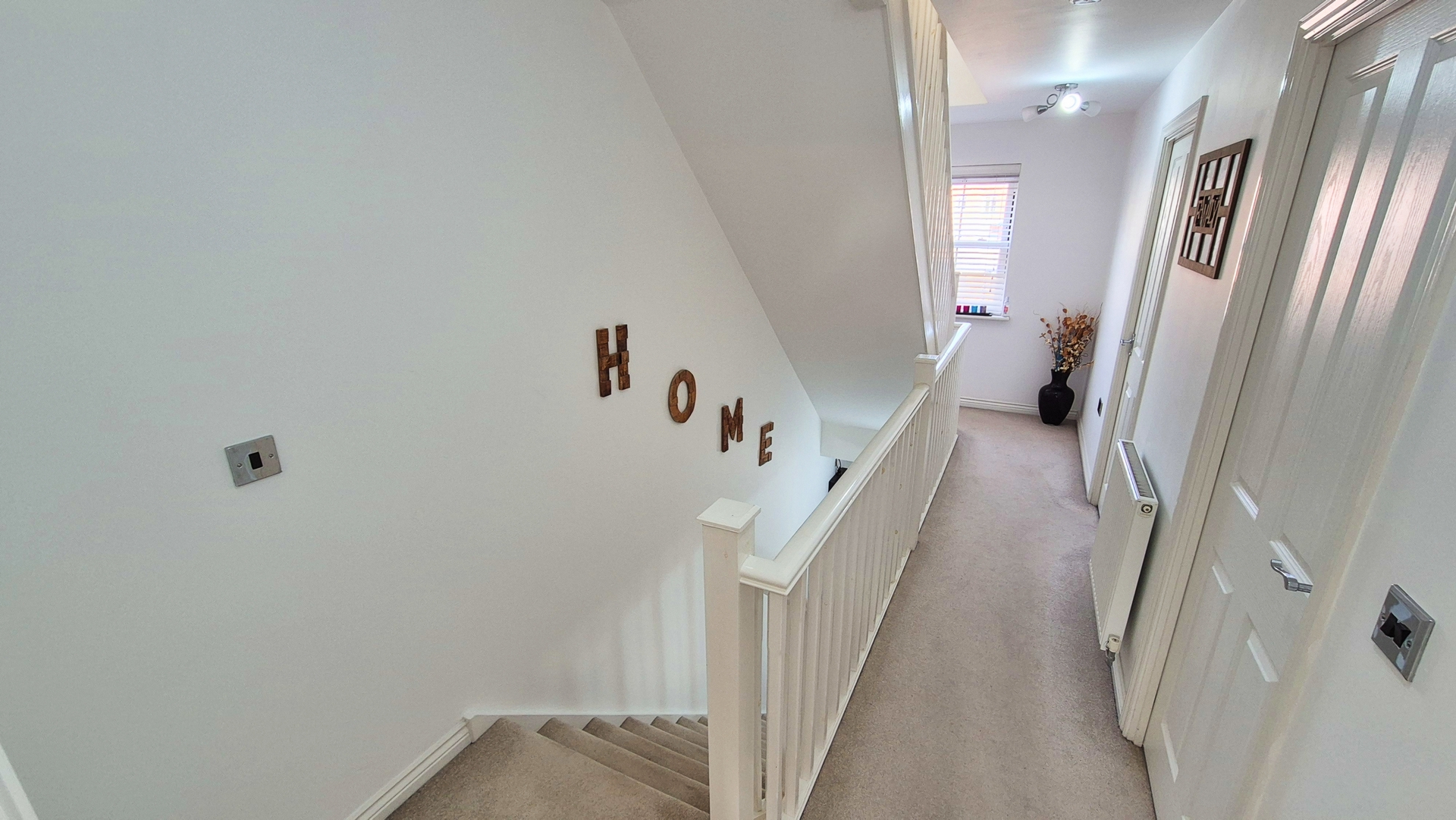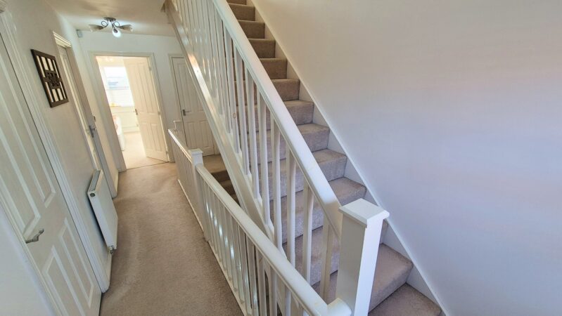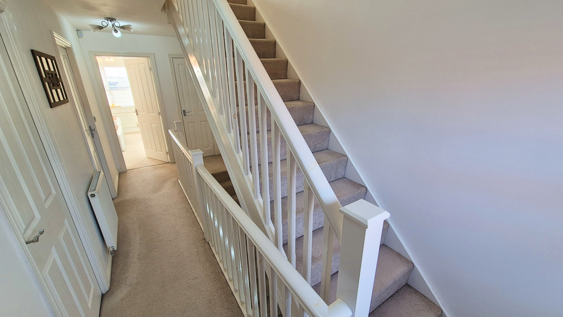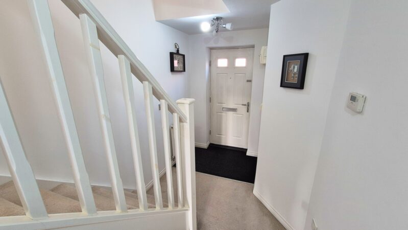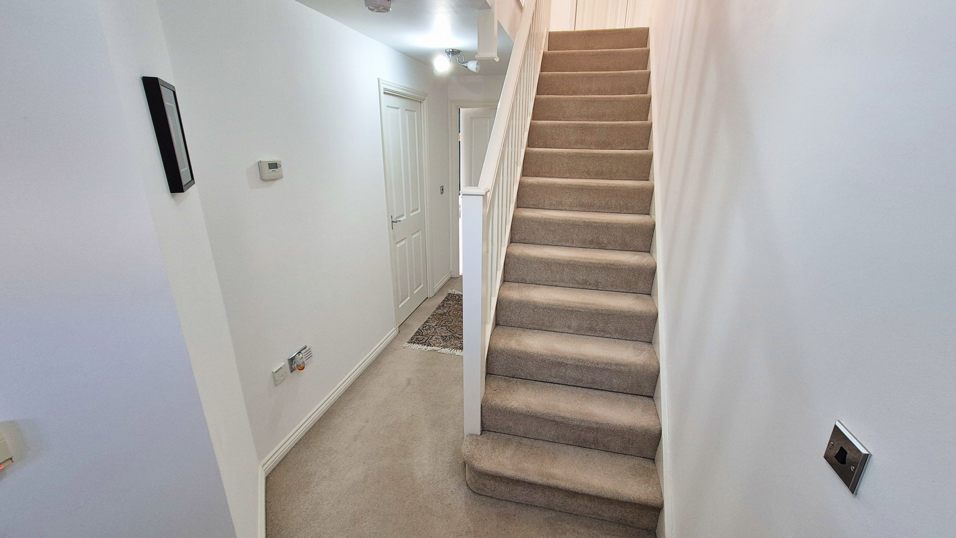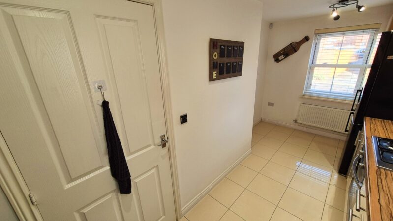Hallway: 1.40m x 4.85m (4'7" x 15'11"), The hallway is accessed through a composite door from the front of the property. The hall provides access to the kitchen, living room, and WC. There is also a staircase that leads to the first floor. The room benefits from a gas central heating radiator and an inset mat near the front door.