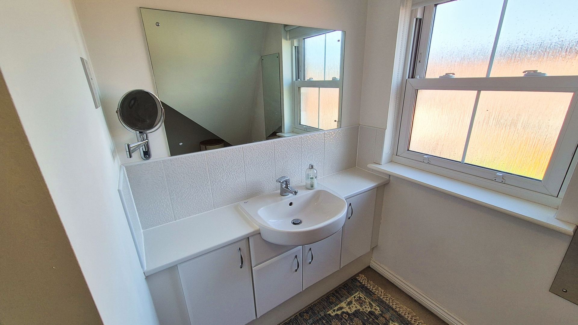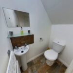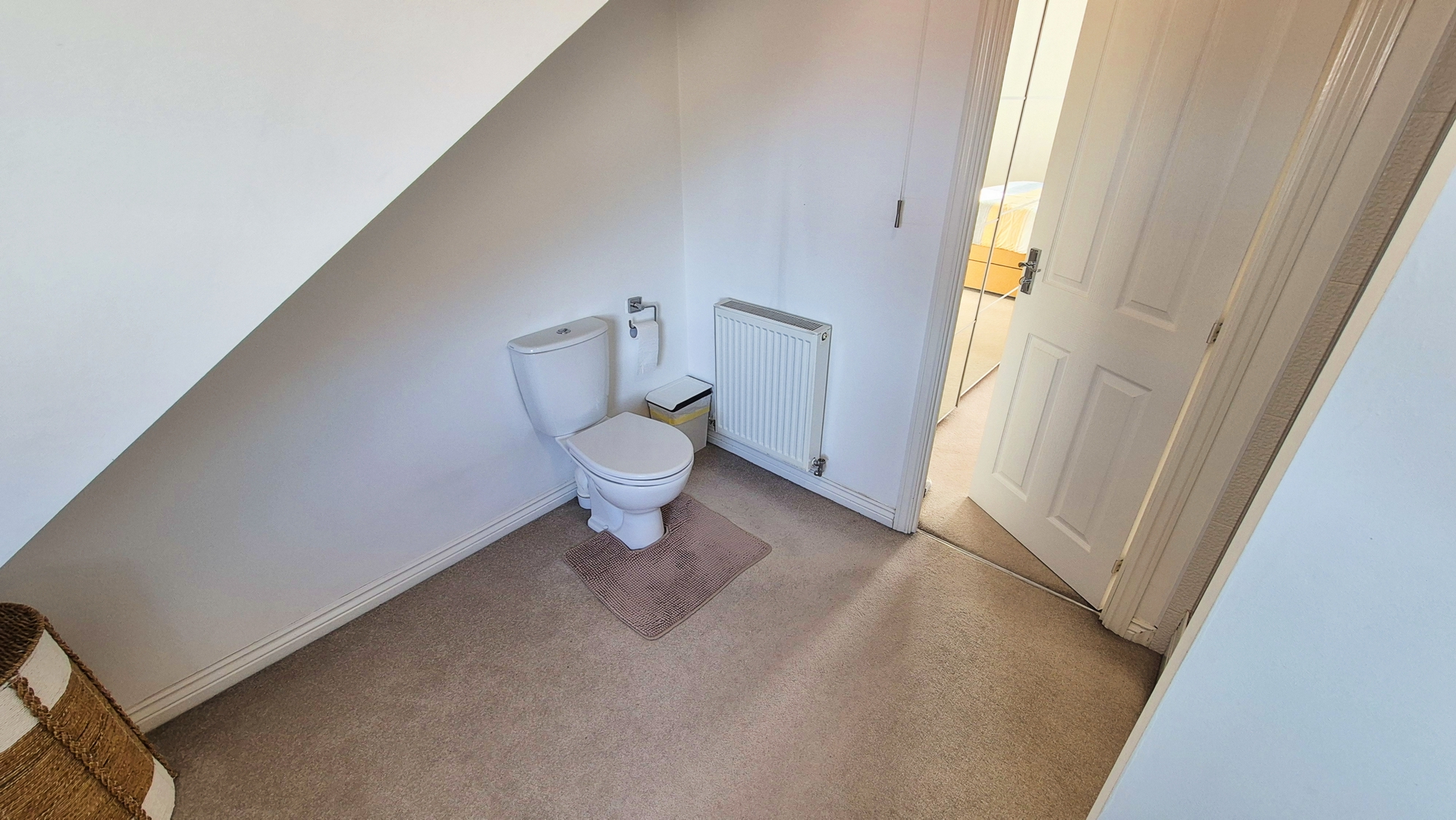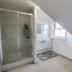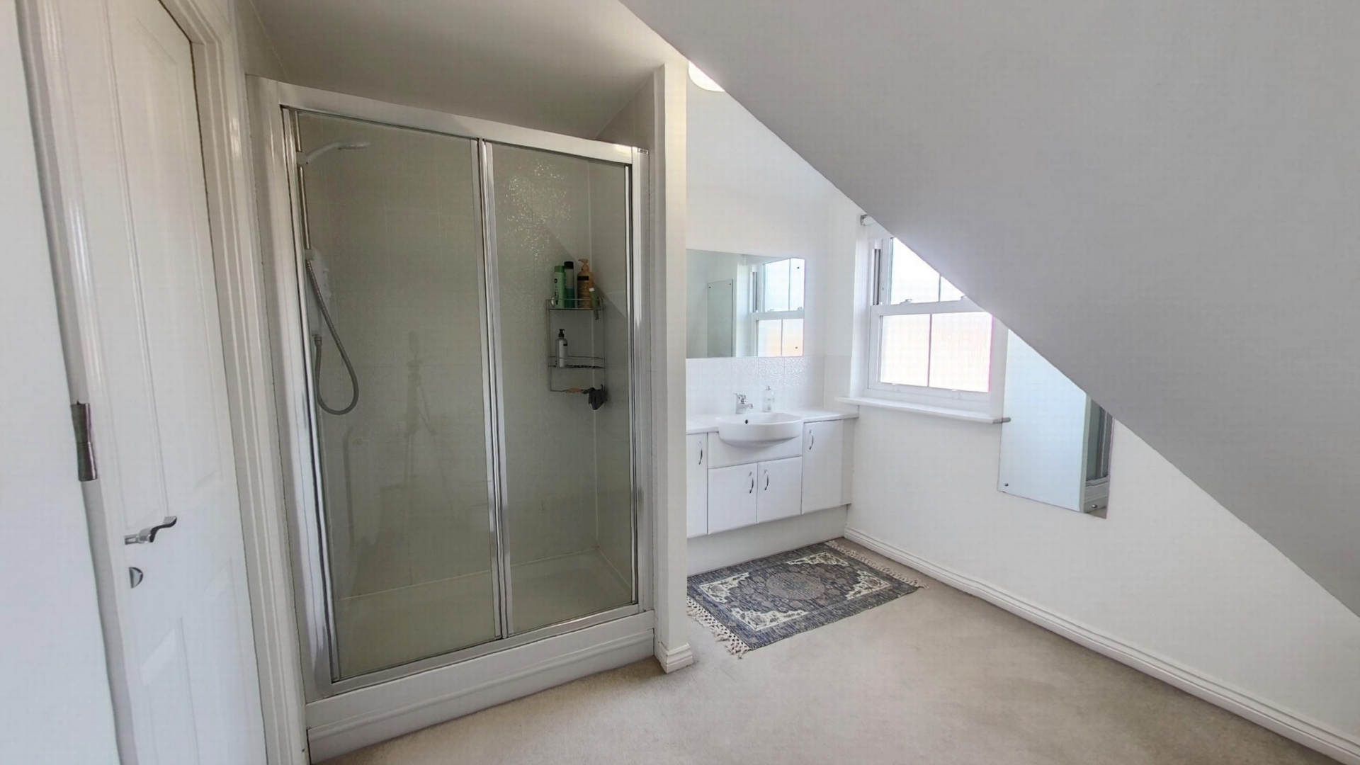 Ensuite: 2.80m x 2.80m (9'2" x 9'2"), The ensuite services bedroom 1, it benefits from a large built-in shower cubicle with an electric shower, a push button toilet, and a wash hand basin set within a wooden vanity unit. The room also benefits from a UPVC double glazed window with privacy glass and a gas central heating radiator. (Please note: this room has reduced headroom in areas due to the pitch of the roof).