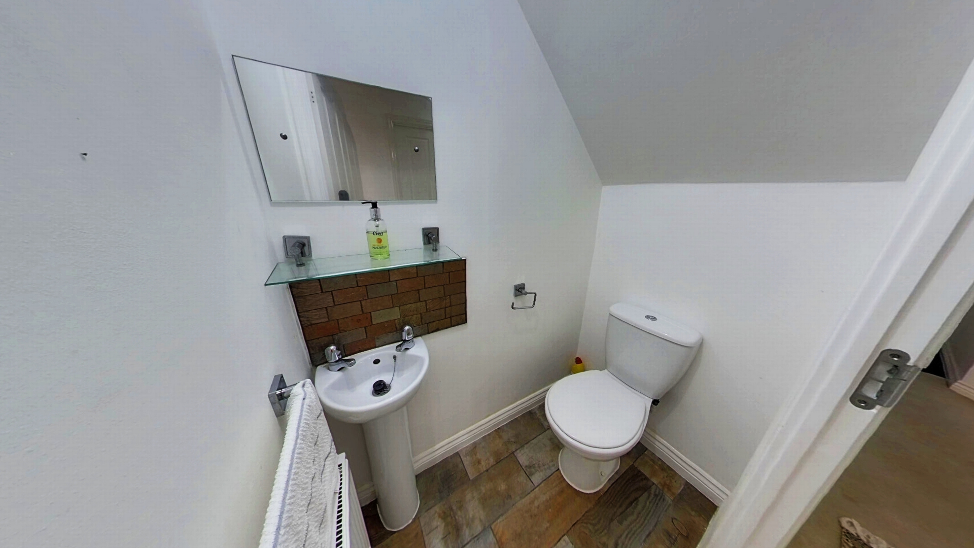 WC: 0.85m x 140.00m (2'9" x 459'4"), The WC is located under the stairs, and it benefits from a white push button toilet and a small wall mounted wash hand basin with a matching pedestal. The room also has a small gas central heating radiator.
