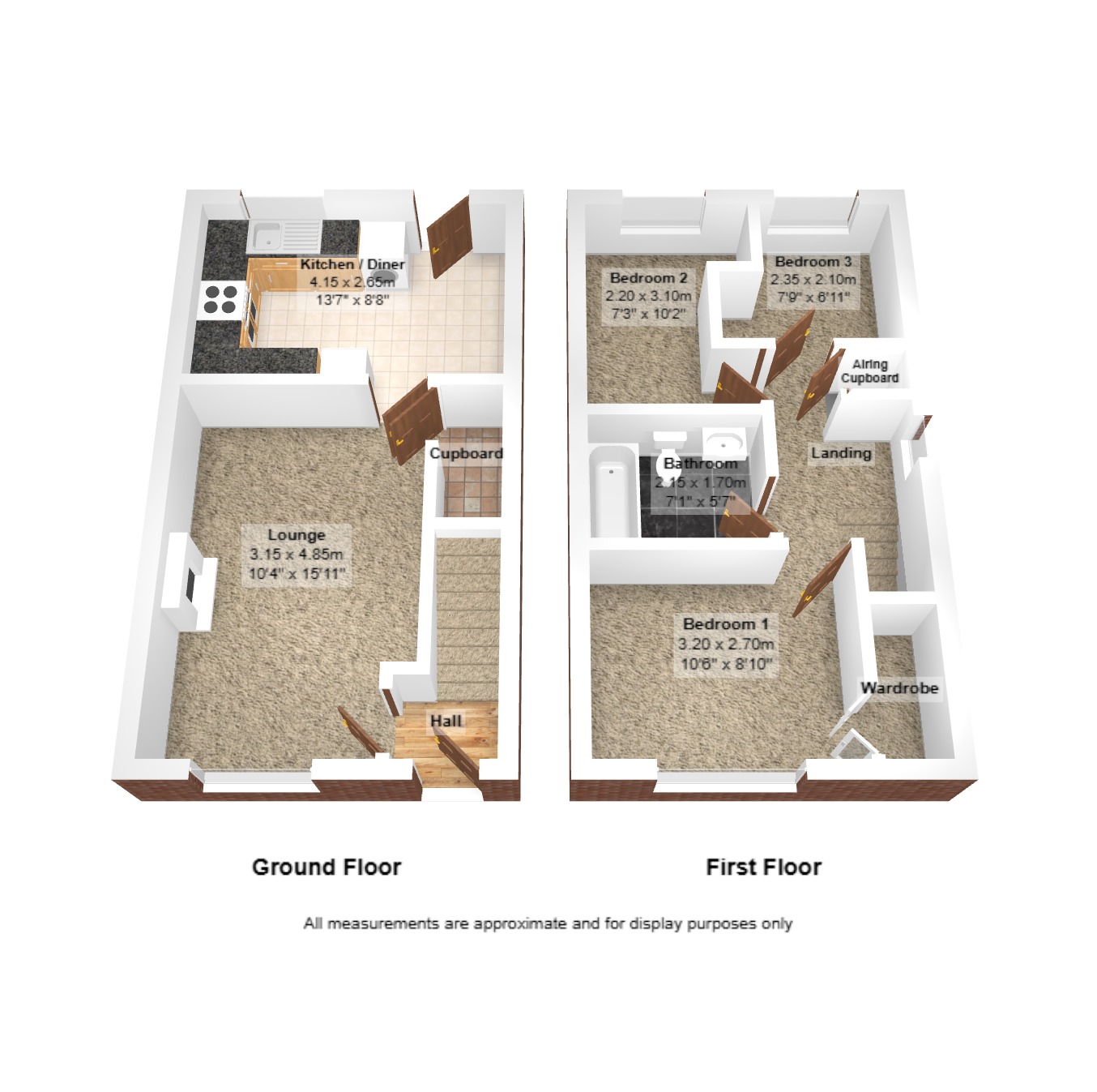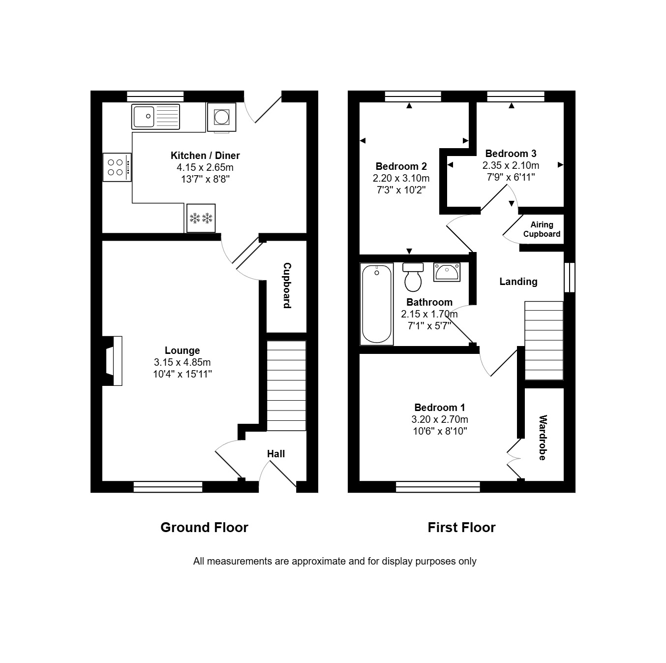 Lounge: 3.15m x 4.85m (10'4" x 15'11"), The longe is located to the front of the property and provides access to the hall and kitchen. There is also a door that leads into the understairs cupboard. The room features a fireplace with space for an electric fire, a UPVC window that overlooks the front garden and 2 gas central heating radiators.