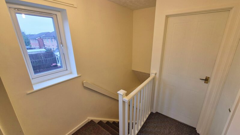 Hall: 0.80m x 1.30m (2'7" x 4'3"), The hall is accessed through a UPVC double glazed door and provides access to the lounge and first floor. It benefits from laminate flooring and a gas central heating radiator.