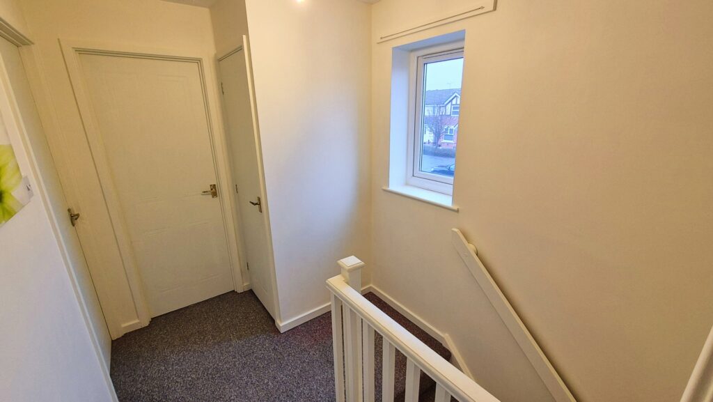 Hall: 0.80m x 1.30m (2'7" x 4'3"), The hall is accessed through a UPVC double glazed door and provides access to the lounge and first floor. It benefits from laminate flooring and a gas central heating radiator.