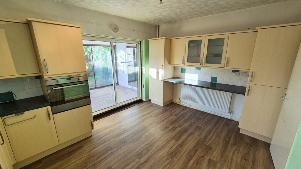 Kitchen / Diner: 4.35m x 3.55m (14'3" x 11'8"), The kitchen / diner is located on the first floor to the rear of the house and benefits from a range of built in units and includes a built-in electric oven, a gas hob, fridge freezer, and a breakfast bar. There is a large side facing UPVC double glazed window and a double glazed sliding patio door which leads to the sun room.