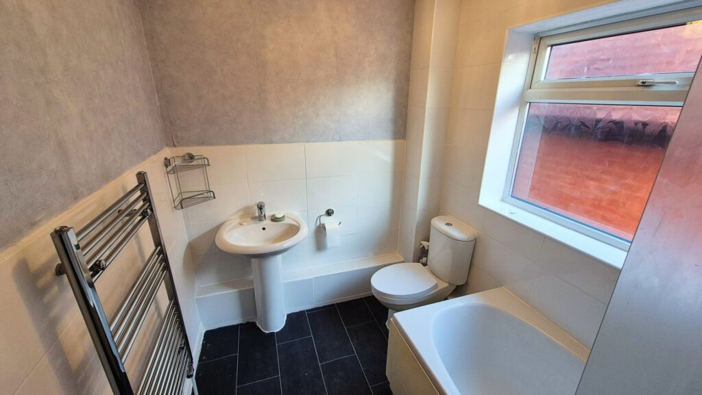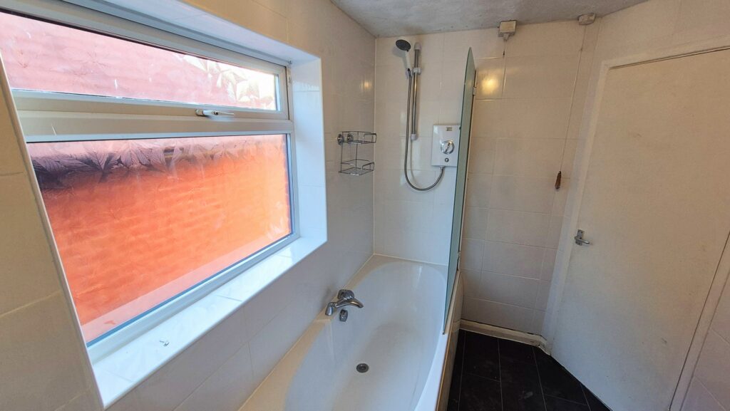 Bathroom: 1.85m x 2.65m (6'1" x 8'8"), The bathroom is located on the third floor and is located over the utility room. It benefits from a white bathroom suite including a bath with glass shower screen and an electric shower.