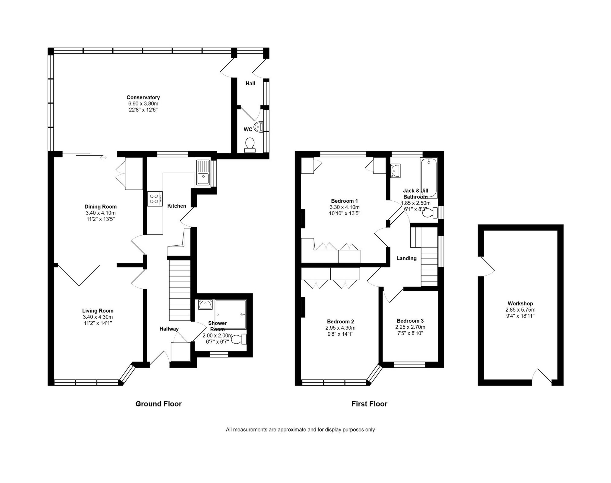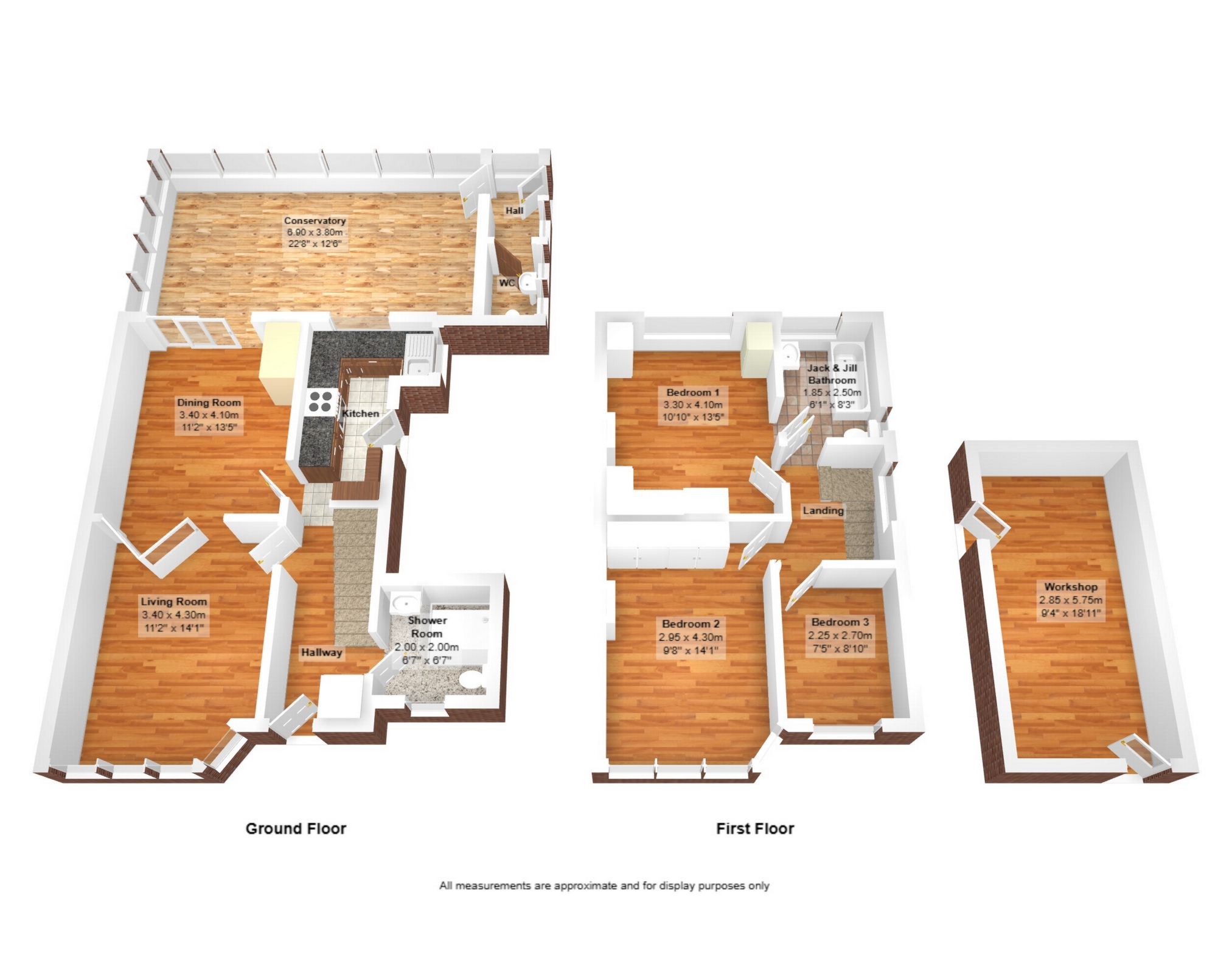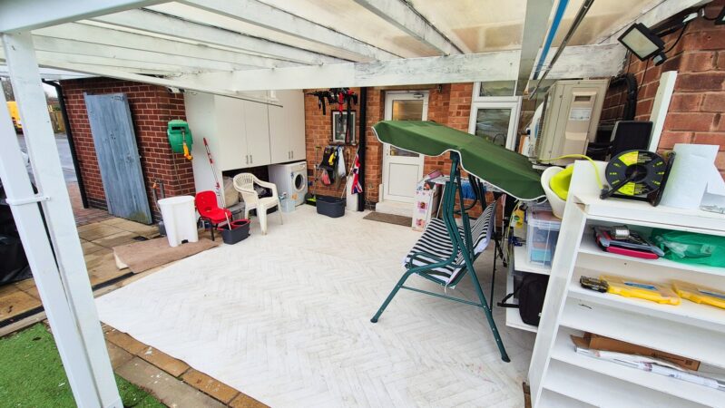 Outside: To the front of the property there is a block paved driveway with space to park 2 vehicles and access to the workshop and garden. To the rear of the property is an easy maintenance garden with a large astro turf lawn, a good sized patio under a large covered pergola, with an additional covered section to the side of the conservatory. Towards the back of the garden there is a gravelled section with a large plastic shed on a concrete base and a set of wooden gates which provide vehicular access from Meadow Lane behind. The workshop is a converted garage which has been insulated and wired with electrics and plumbing, and an air conditioning system as it was previously used for a dog grooming business.