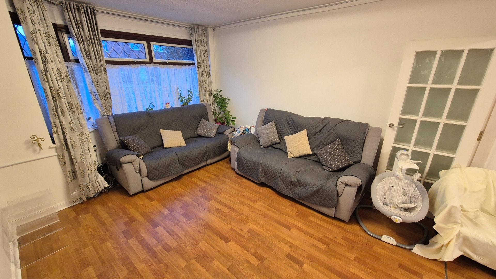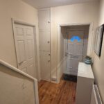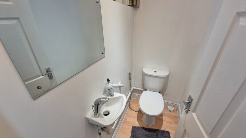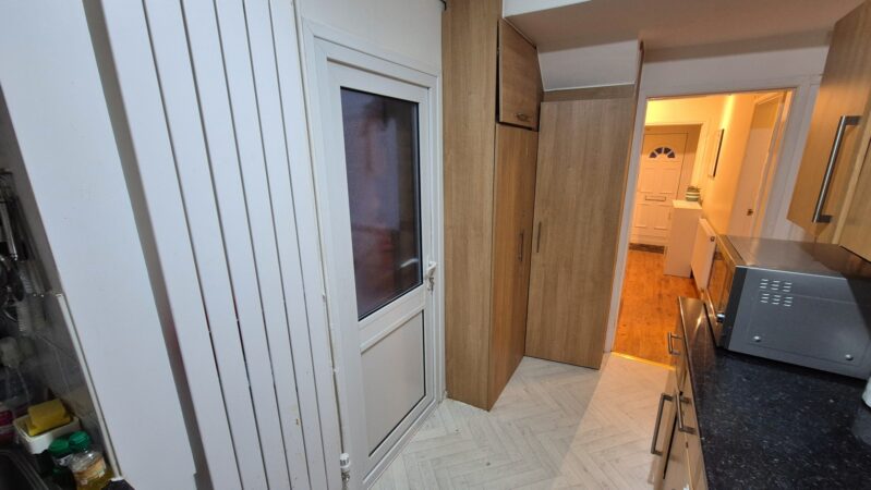 Hallway: 1.75m x 3.25m (5'9" x 10'8"), The hallway is accessed via the UPVC door from the front and provides direct access to the downstairs WC, the living room, and the kitchen. The room has laminate flooring, a gas central heating radiator and several built-in cupboards