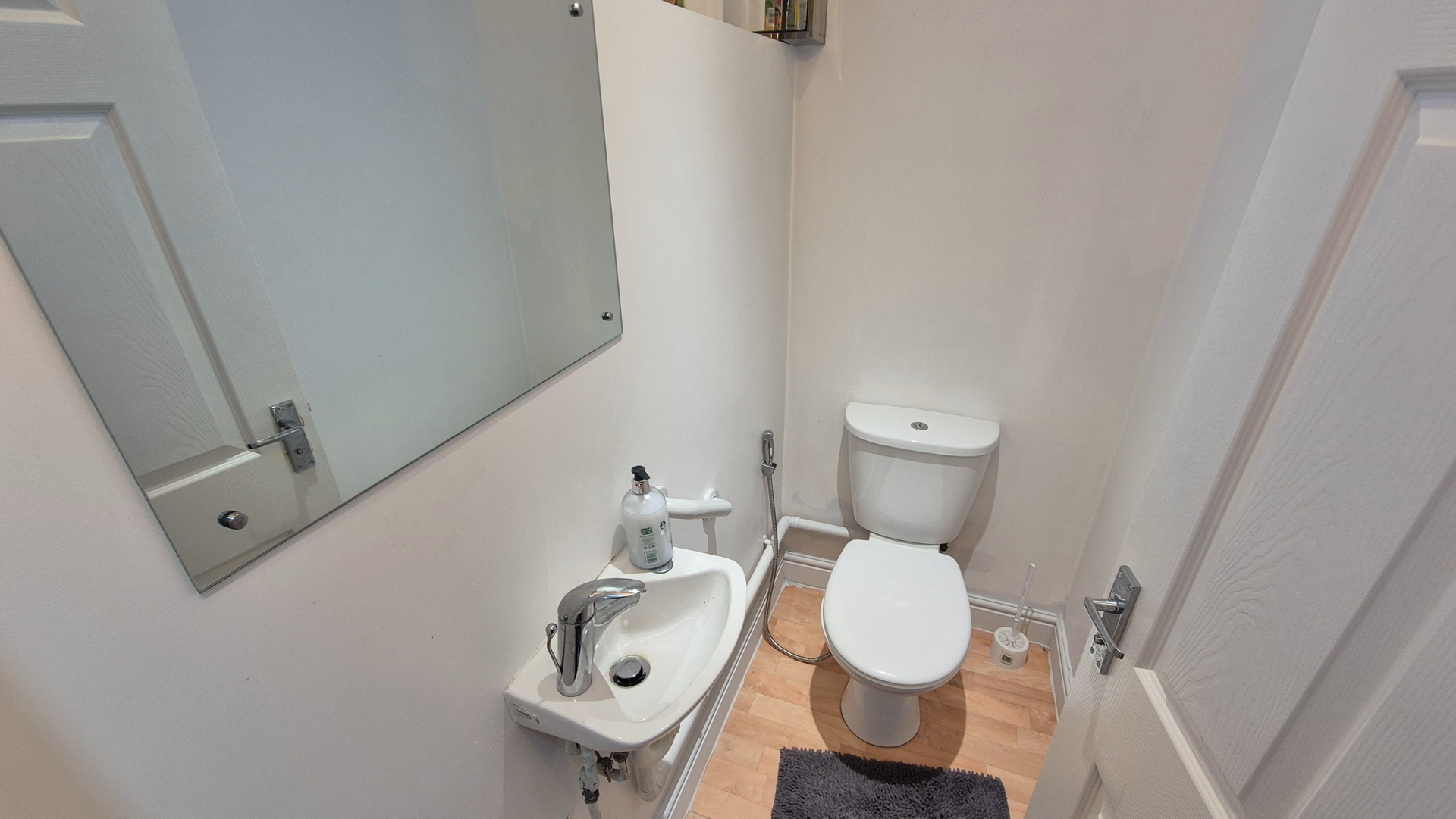 WC: 1.70m x 0.95m (5'7" x 3'1"), Located off the conservatory the WC features a white suite including a push button toilet and a wall hung basin with mixer tap. The room also benefits from UPVC double glazed windows and laminate flooring.