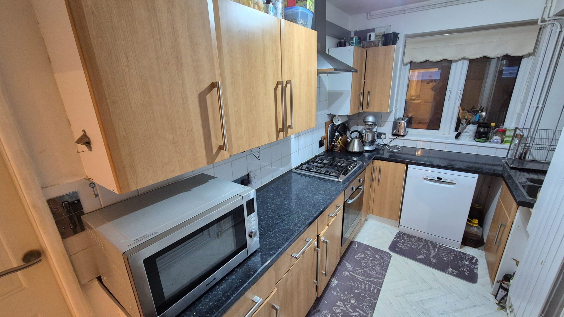 Kitchen: 2.45m x 4.50m (8'0" x 14'9"), The kitchen is located to the centre of the property and can be accessed from either the hallway or the garden. The room features wood veneer units and a granite effect worktop. There is an electric oven, a built-in gas hob, with a cooker hood above, there is also space for a freestanding dishwasher. The room has a modern tall column radiator, two windows one looking into the conservatory and the second looking out over the garden.