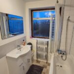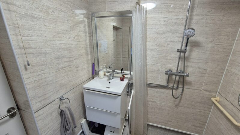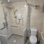 Shower Room: 2.00m x 2.00m (6'7" x 6'7"), The shower room is located to the front of the property off the hallway. The room features a step free shower, a push button toilet, and a wash hand basin set within a wooden vanity unit. There is a window with privacy glass overlooking the drive and a tall column radiator.