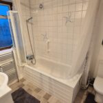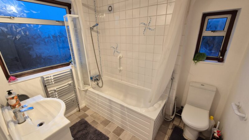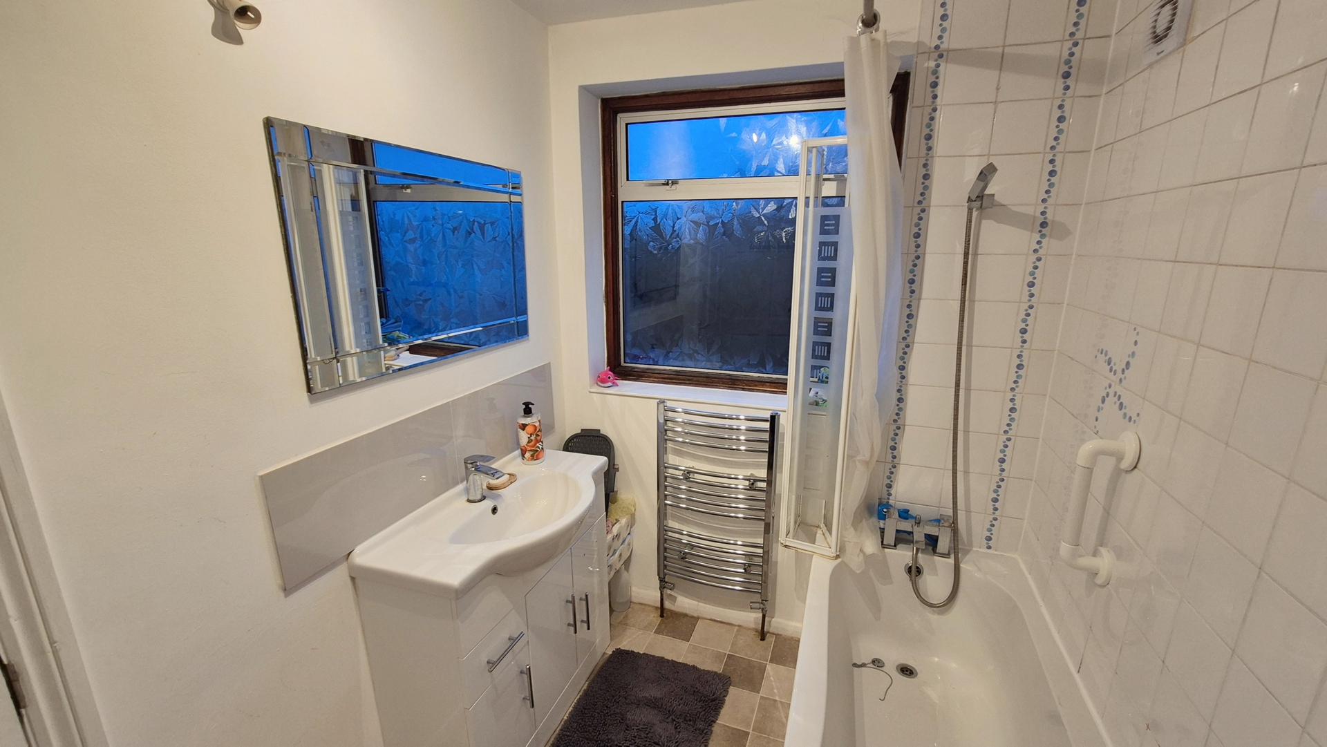 Jack & Jill Bathroom: 1.85m x 2.50m (6'1" x 8'2"), The Jack & Jill bathroom is located to the rear of the property over the kitchen. The room benefits from a white suite including a push button toilet, a wash hand basin set within a wooden vanity unit and a bath with a mixer shower off the taps, and a folding glass shower screen. The room has vinyl flooring, a double glazed window and a chrome gas central heating towel radiator. There are 2 doors one leads to the landing and the other to bedroom 1 giving it Jack & Jill access.
