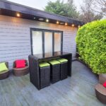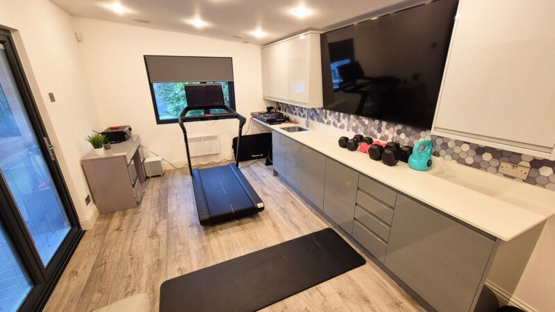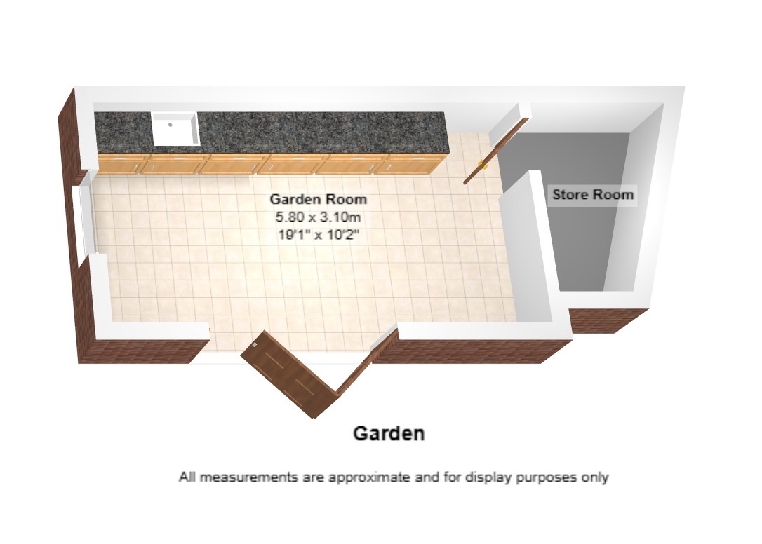 Garden Room: 5.80m x 3.10m (19'0" x 10'2"), The garden room is set on top of a raised wooden deck within the garden. It features bi-fold doors that lead out to the deck and a separate UPVC double glazed window that overlooks the garden. The room benefits from a kitchenette, ceiling mounted speakers, 2 electric heaters and a small store room.