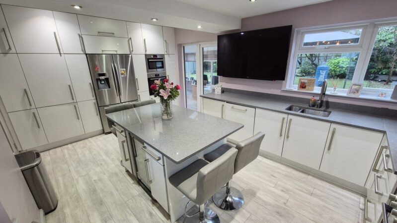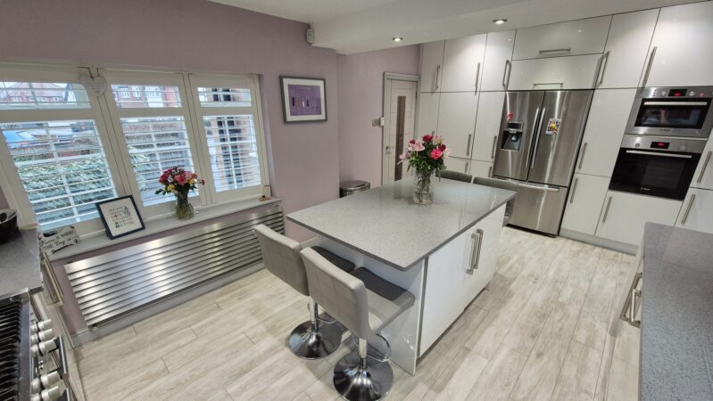 Kitchen / Diner: 5.65m x 3.60m (18'6" x 11'10"), The kitchen / diner is located off the hallway and provides access to the sun room through a UPVC double glazed door. The room features a modern white gloss kitchen with Quartz worktops and a large dual fuel range cooker with a stainless steel cooker hood above. The kitchen benefits from built-in appliances such as a washer dryer, a dishwasher, a single electric oven, a built-in microwave oven, and an under counter wine chiller. The kitchen also has space for a large freestanding American fridge freezer. The kitchen benefits from amtico flooring with underfloor heating, ceiling mounted speakers, a modern stainless steel gas central heating radiator and 2 UPVC double glazed windows.