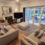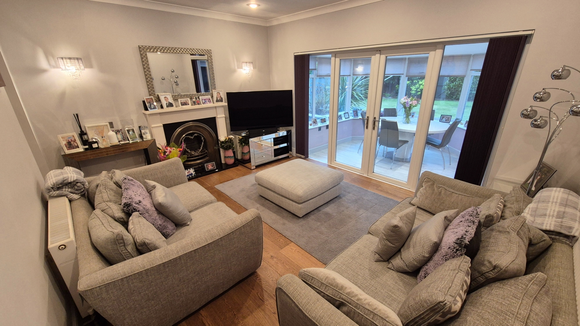 Living Room: 4.55m x 3.60m (14'11" x 11'10"), The living room is located off the hallway and provides access to the office / snug at the front and the large sun room across the back of the property. It features a bronze fireplace, 2 gas central heating radiators, oak flooring, double glazed French doors with large matching windows either side.
