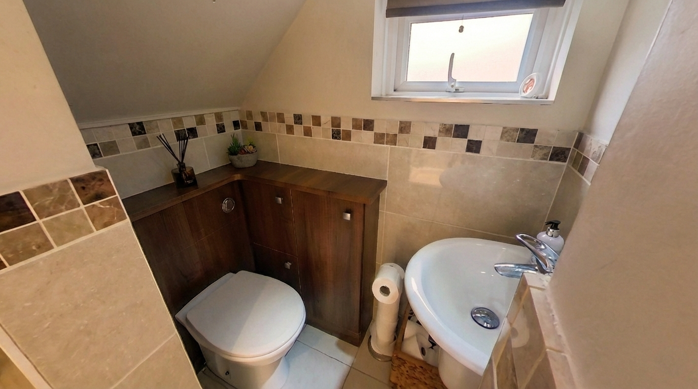 Shower Room: 2.25m x 1.50m (7'5" x 4'11"), The shower room is located off the hallway utilising the space under the stairs. It has a modern toilet with a concealed cistern, a wall mounted basin with a mixer tap and a fully tiled shower enclosure with an electric shower. The room also benefits from a chrome gas central heated towel radiator and a UPVC double glazed window with privacy glass.