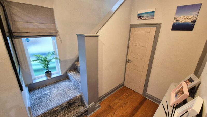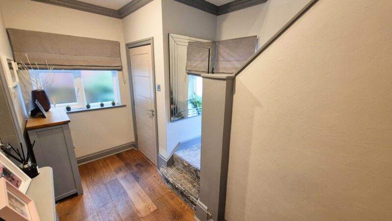Hallway: 3.60m x 2.40m (11'10" x 7'10"), The hallway is accessed from the driveway via the porch. The room benefits from two UPVC double glazed windows with privacy glass, a gas central heating radiator, oak flooring, and solid wood doors that lead to the kitchen / diner, living room and shower room.