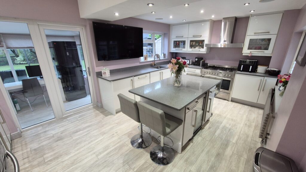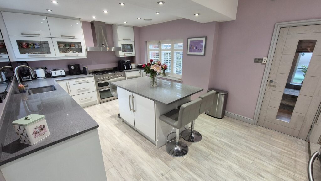 Kitchen / Diner: 5.65m x 3.60m (18'6" x 11'10"), The kitchen / diner is located off the hallway and provides access to the sun room through a UPVC double glazed door. The room features a modern white gloss kitchen with Quartz worktops and a large dual fuel range cooker with a stainless steel cooker hood above. The kitchen benefits from built-in appliances such as a washer dryer, a dishwasher, a single electric oven, a built-in microwave oven, and an under counter wine chiller. The kitchen also has space for a large freestanding American fridge freezer. The kitchen benefits from amtico flooring with underfloor heating, ceiling mounted speakers, a modern stainless steel gas central heating radiator and 2 UPVC double glazed windows.