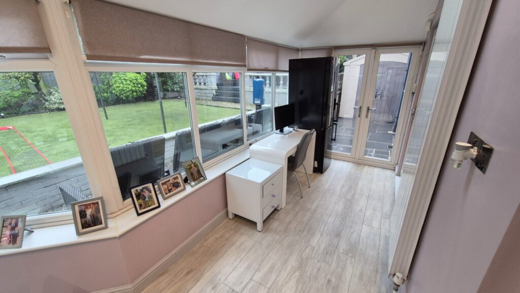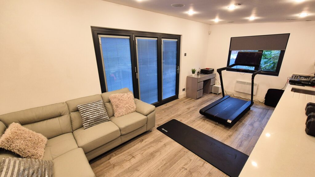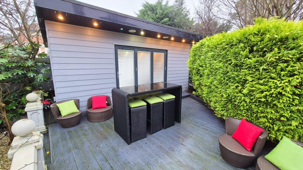 Garden Room: 5.80m x 3.10m (19'0" x 10'2"), The garden room is set on top of a raised wooden deck within the garden. It features bi-fold doors that lead out to the deck and a separate UPVC double glazed window that overlooks the garden. The room benefits from a kitchenette, ceiling mounted speakers, 2 electric heaters and a small store room.
