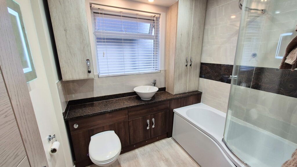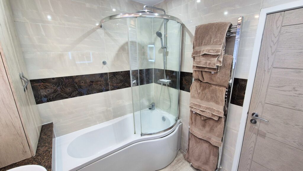 Bathroom: 2.05m x 2.40m (6'9" x 7'10"), The bathroom is located to the front of the property over the hallway. It features a large P shaped bath with a matching glass shower screen and a mixer shower. There is a wall-to-wall worktop with cupboards above and below, a wall hung toilet, and a basin sat on top of the worktop. The room also benefits from a large chrome gas central heating radiator, a modern chrome gas central heating radiator and a UPVC window with privacy glass.
