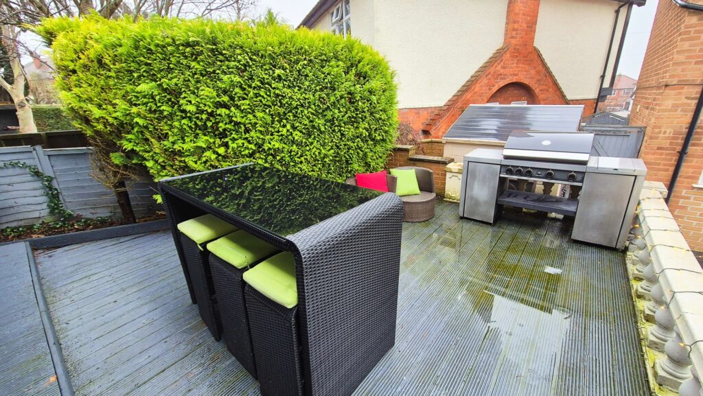 Outside: To the rear of the property there is an easy maintenance garden made up of a patio, a large astro turf lawn area and a raised deck on top of which there is a large garden room. To the side of the property there is a small wooden shed for storage and to the other side there is a large plastic shed located next to a wooden gate that leads to the driveway. To the front of the property there is a large Tarmac driveway with a wall mounted electric car charger.