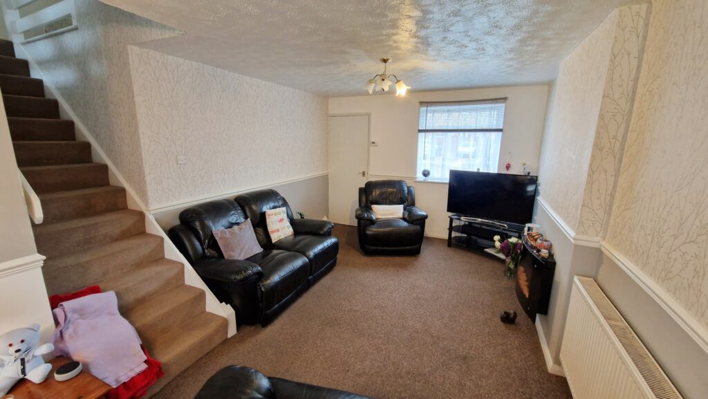 Lounge / Diner: 3.30m x 7.10m (10'10" x 23'4"), The lounge / diner benefits from dual aspect views with windows overlooking both the front and rear gardens. There is an electric wall mounted fire and 3 gas central heating radiators. There are wooden doors that lead to the porch and kitchen and an open staircase that provides access to the first floor.